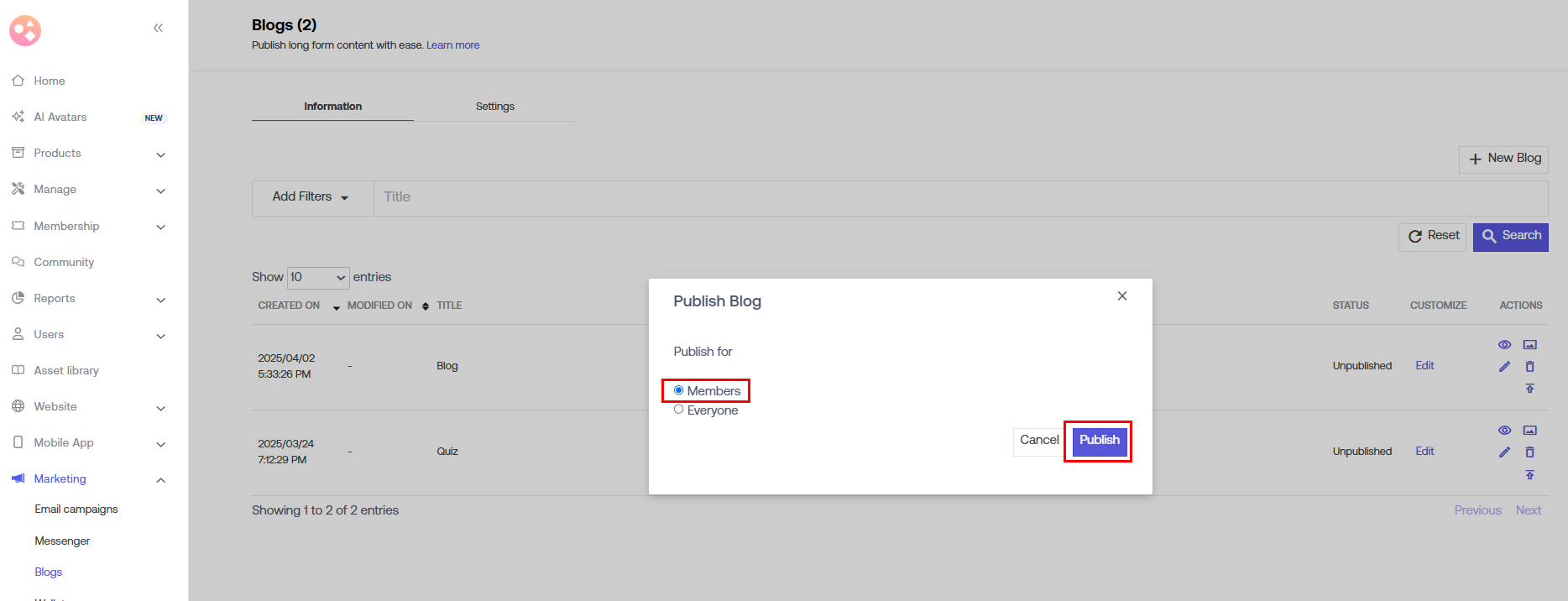 Select Members to keep the blog under membership. Click Publish to make the blog live.