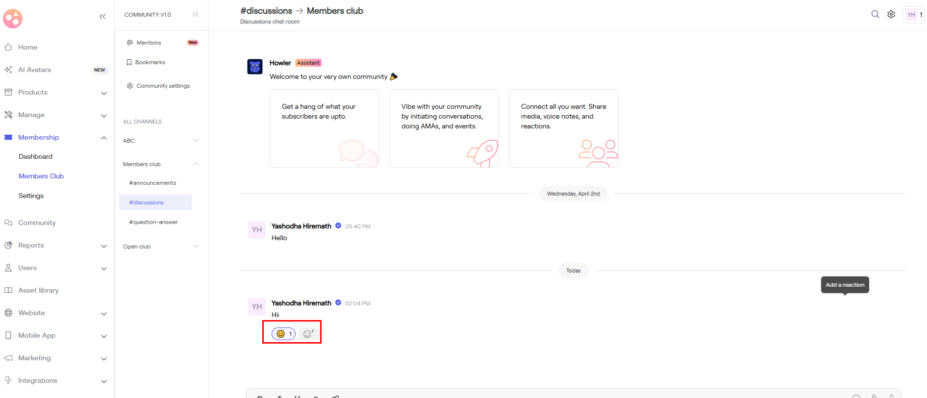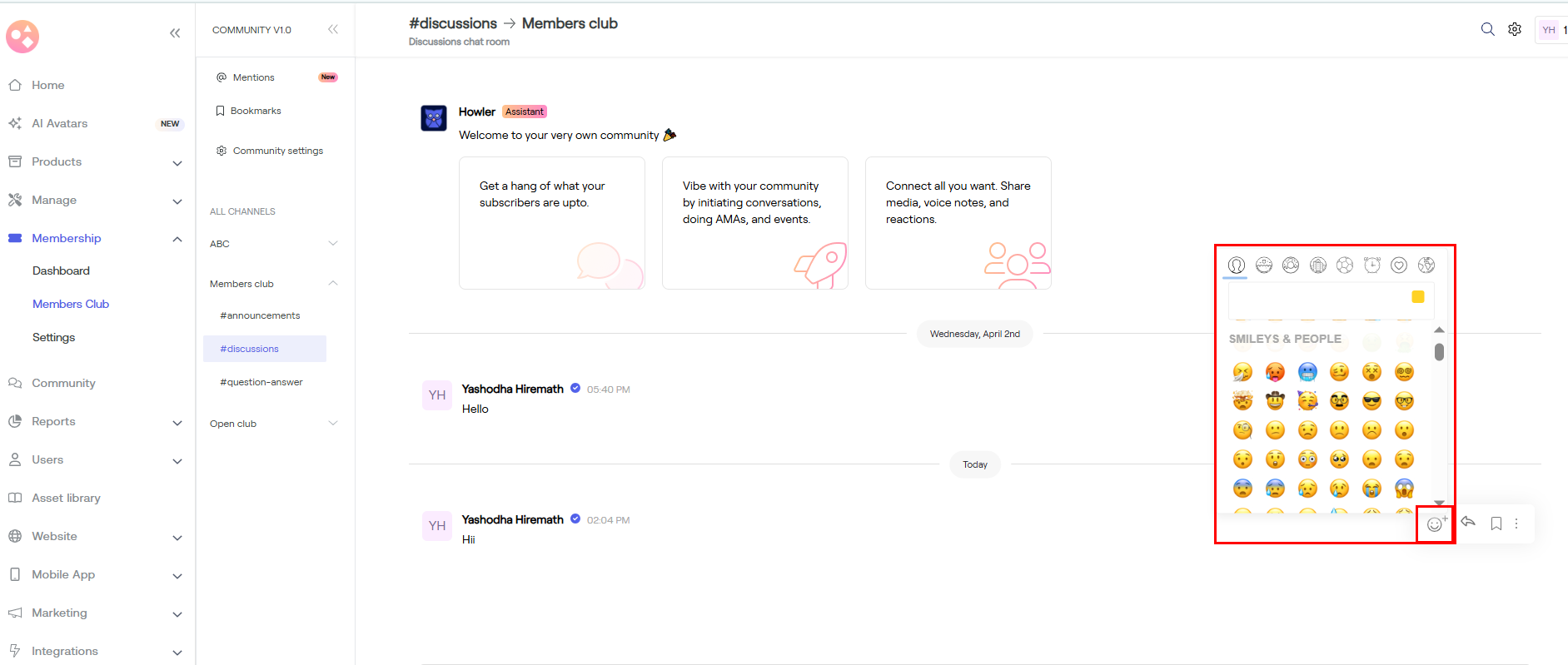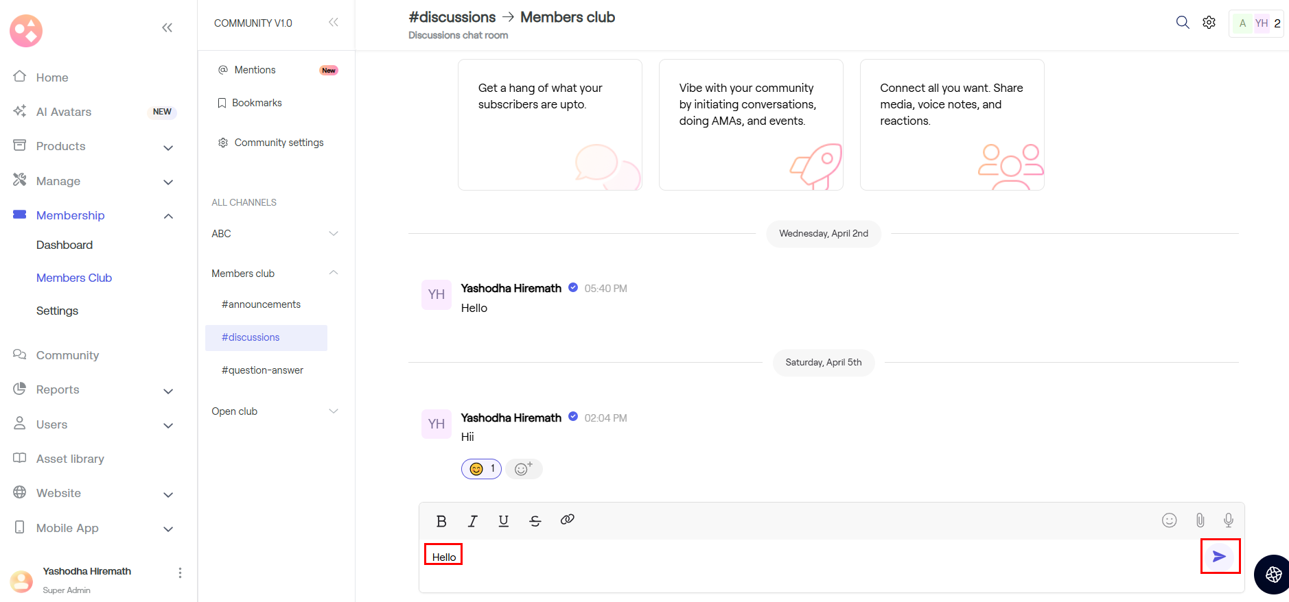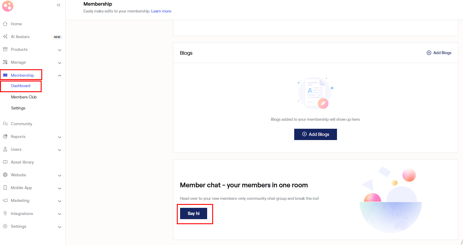 a) Go to Membership > Dashboard > Scroll down > Member chat > Tap on Say hi.