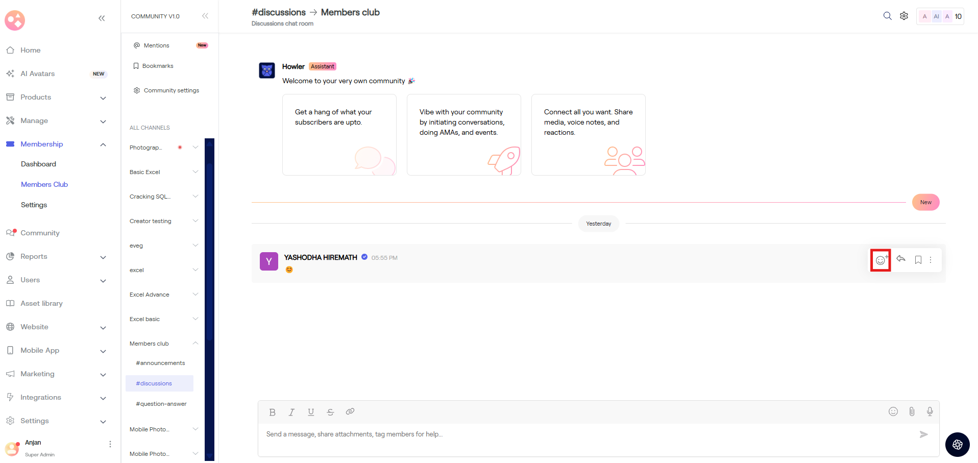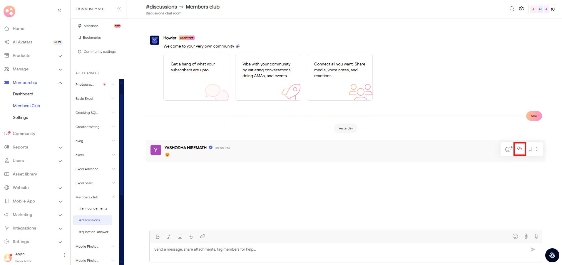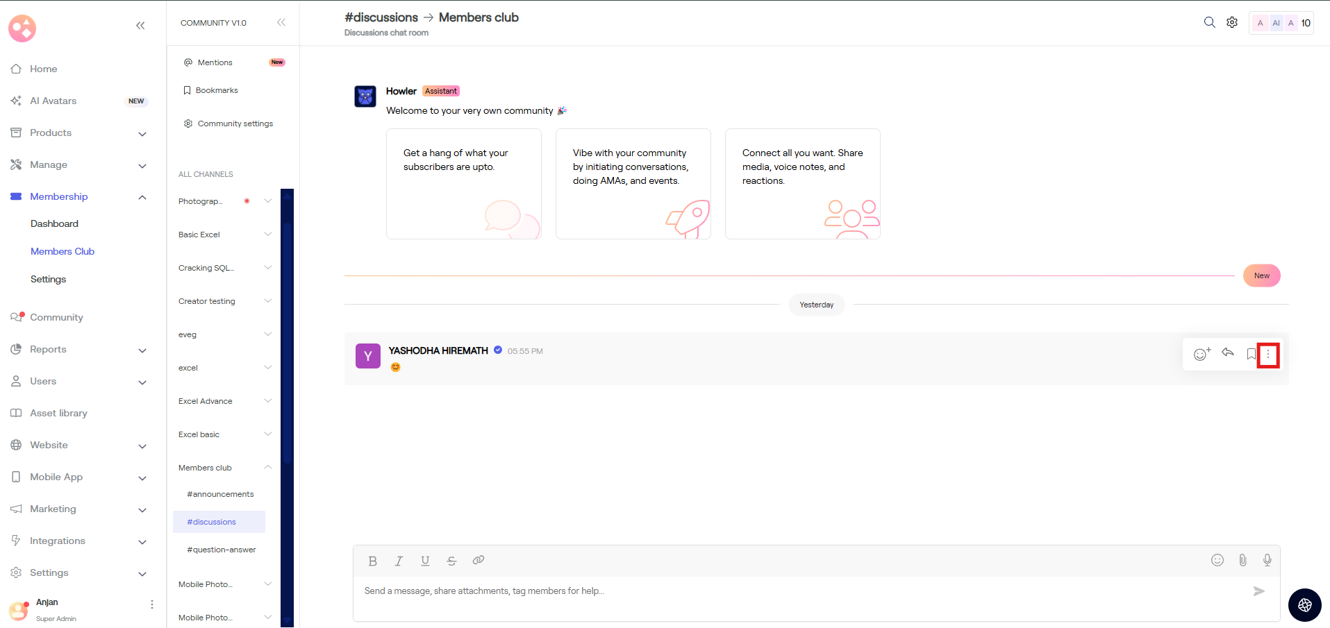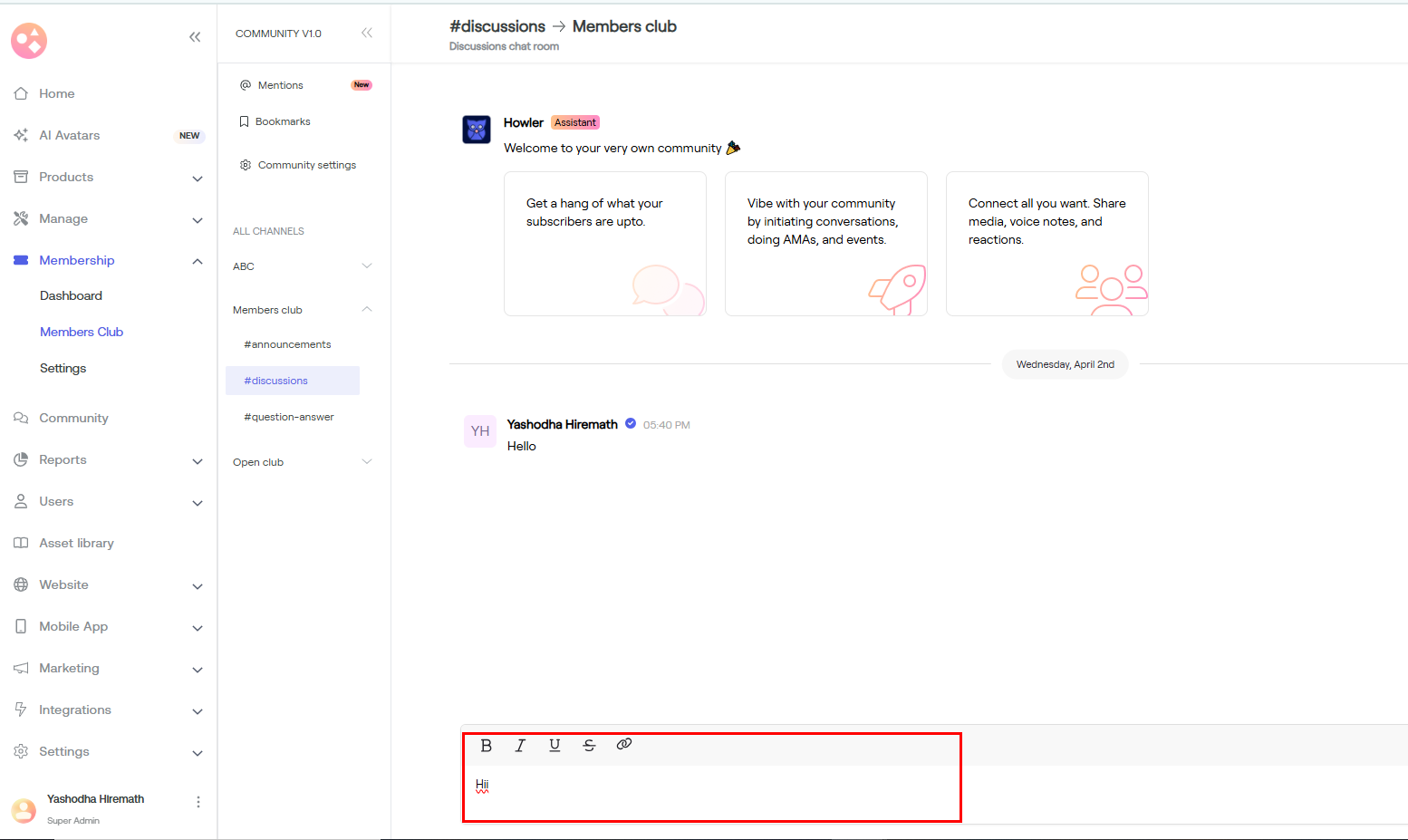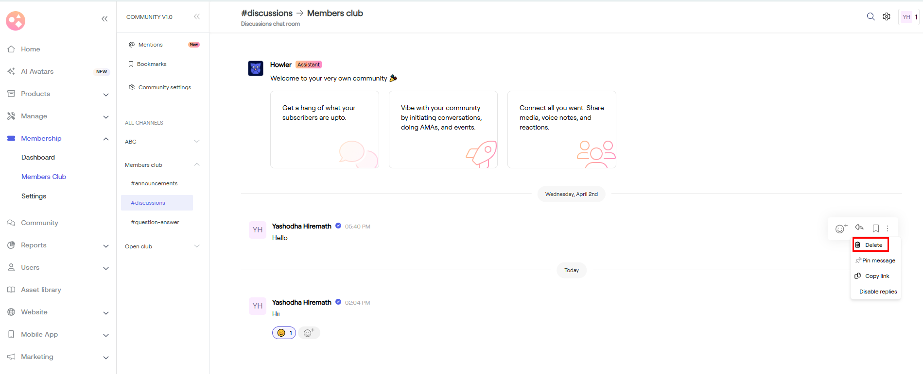 a) Go to Membership > Dashboard > Scroll down > Member chat > Tap on Say hi.