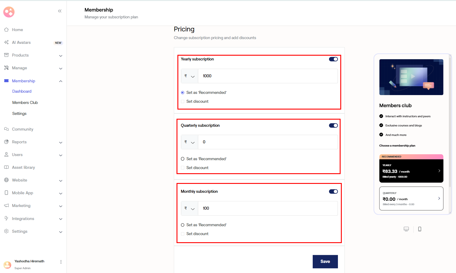 Now enter the price for the Yearly, Quarterly and Monthly Subscriptions.