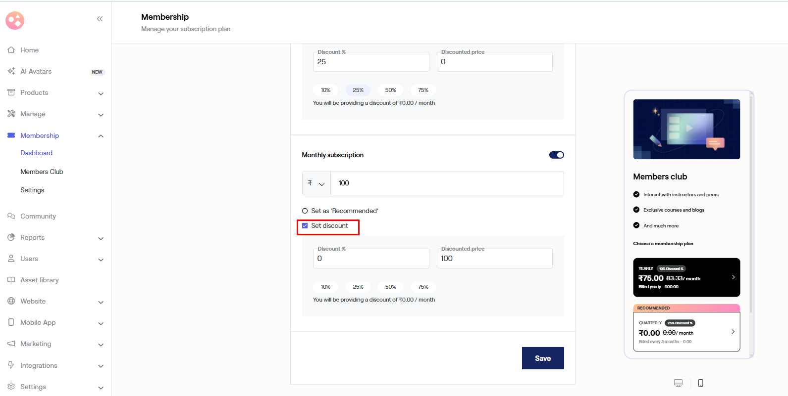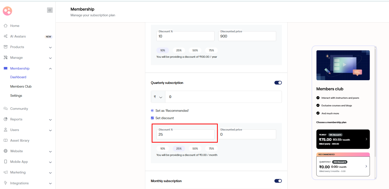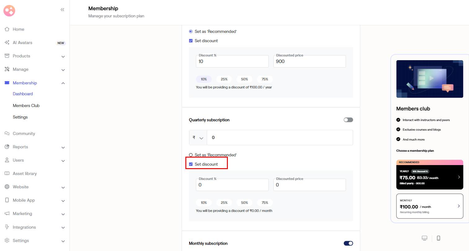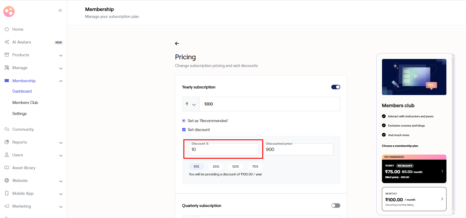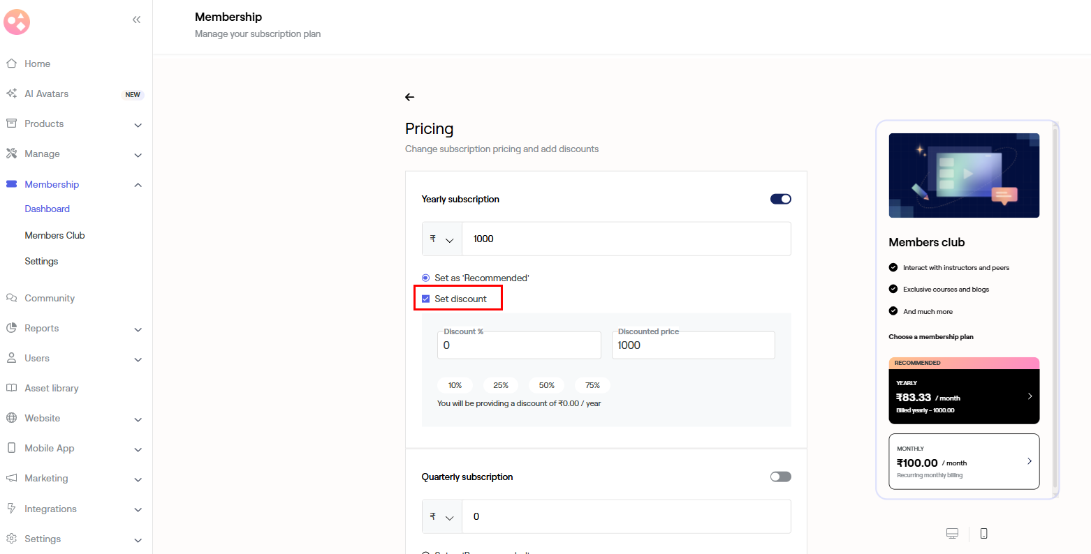 Pricing - It will help you modify your subscriptions and add a discount for your members.