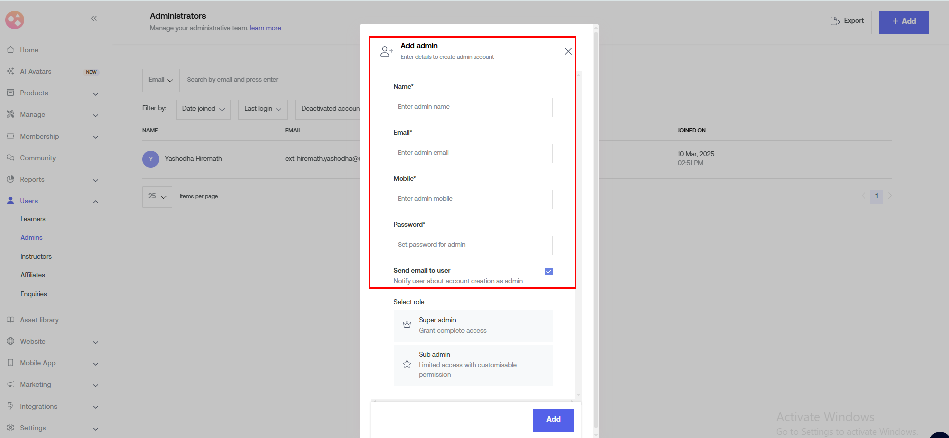 To add a sub-admin go to Admins. Then on the top right corner tap +Add.
