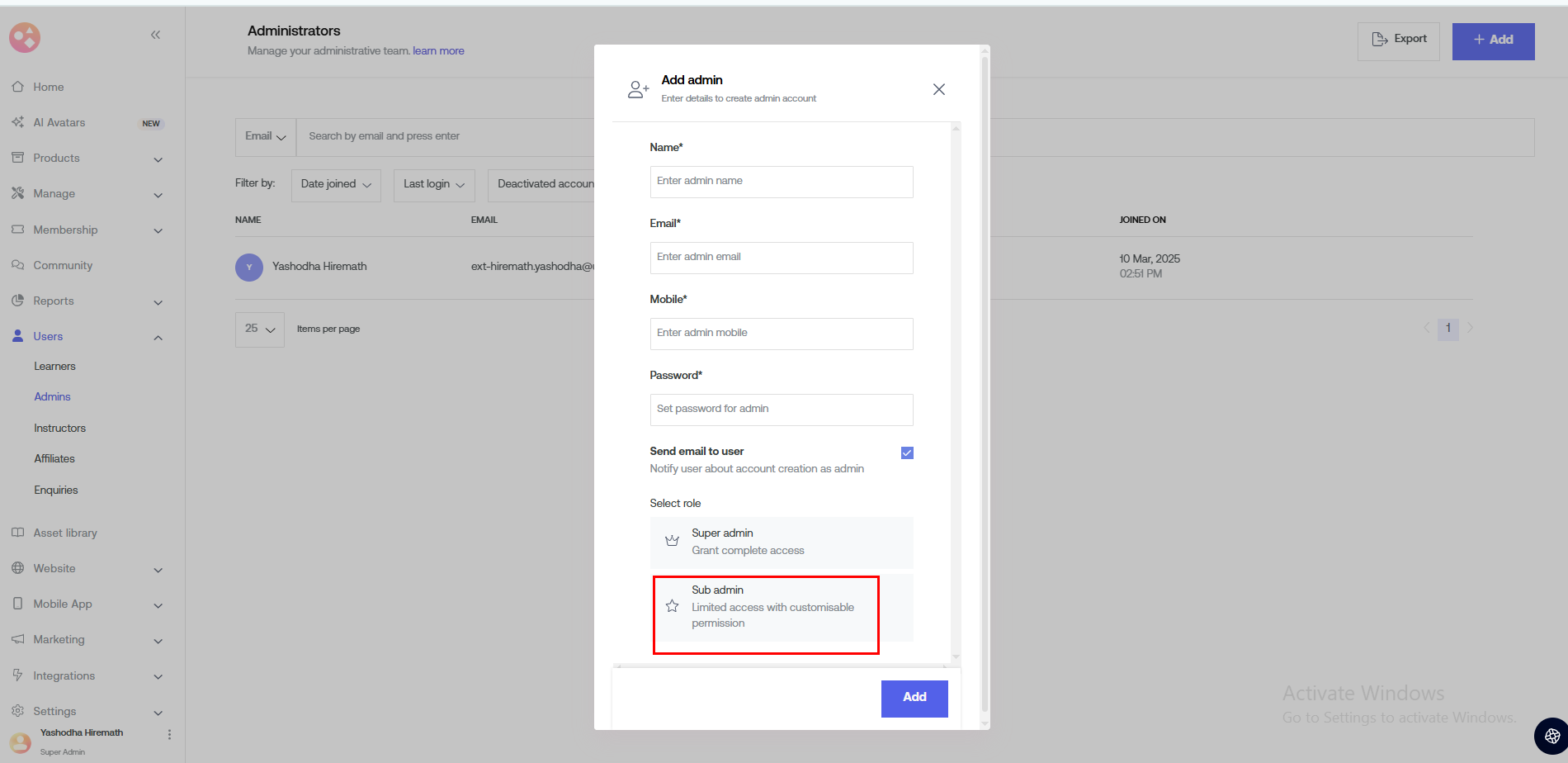 Under Select role, select Sub-admin.
