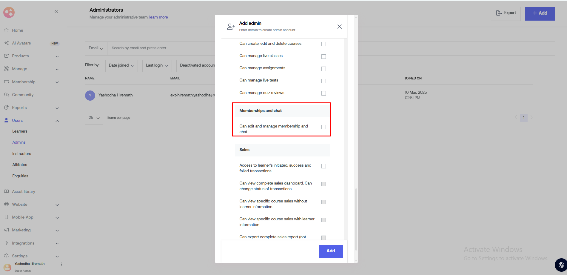 Then scroll down to Memberships and chat. Click the checkbox to give the edit membership and group chat access.