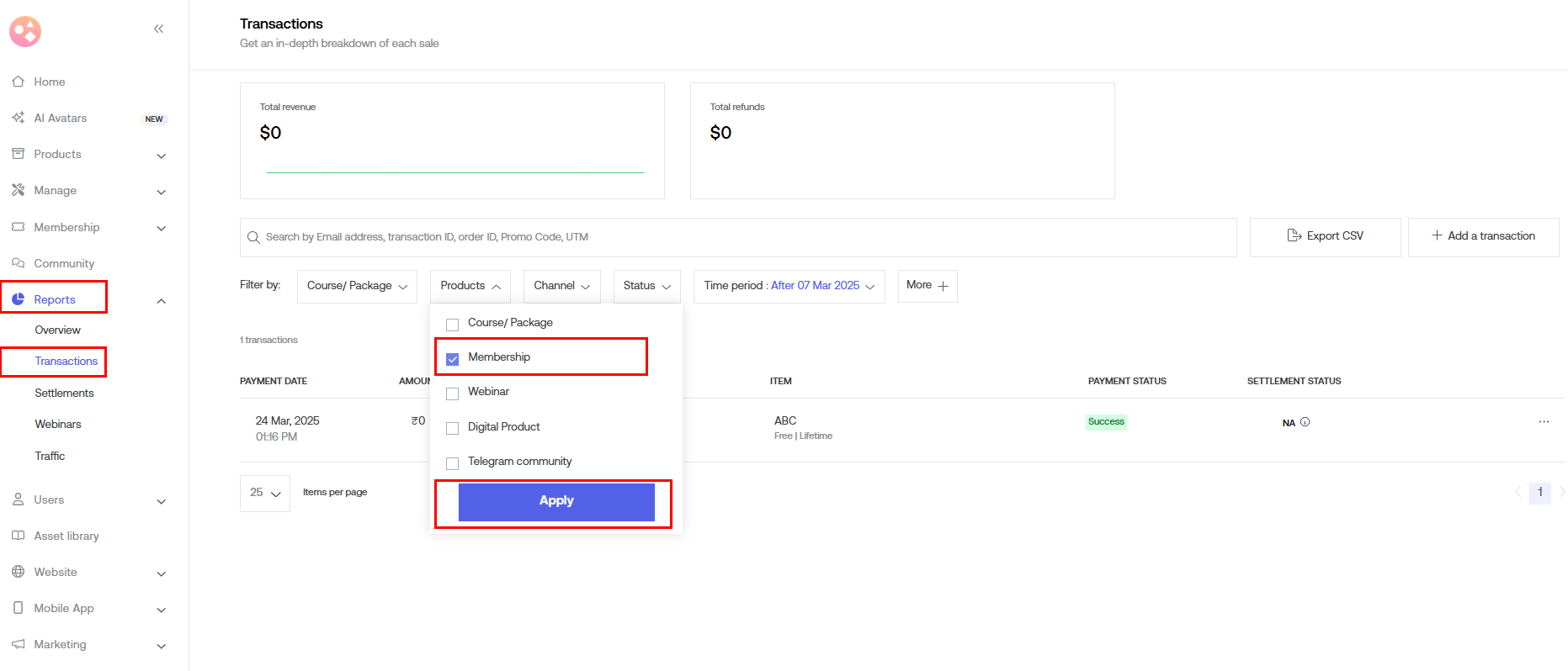 Under Transactions, click filter by product. Select Membership under Product and click Apply.