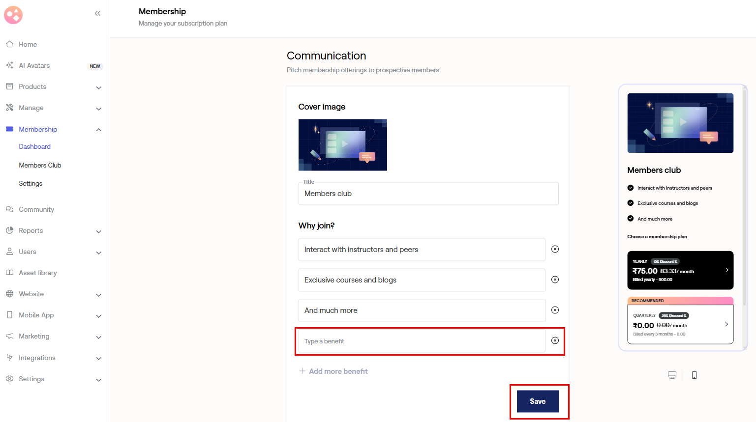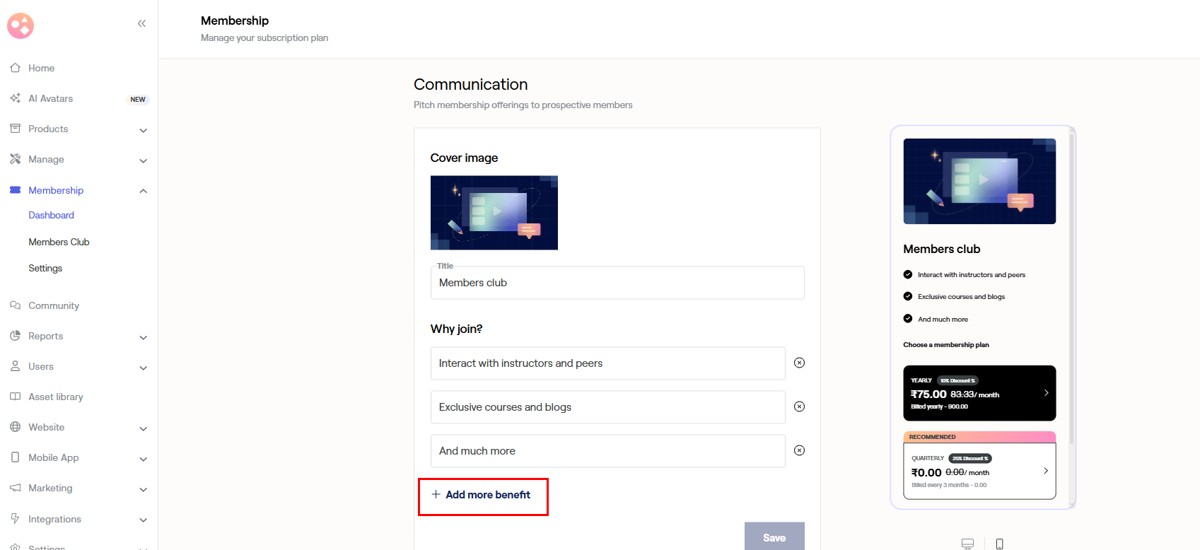To offer more benefits to your subscribers select +Add more benefits. Enter the benefit and click Save.
