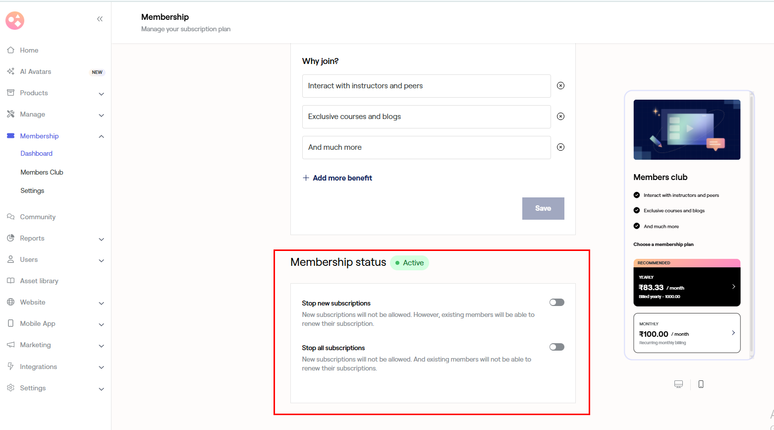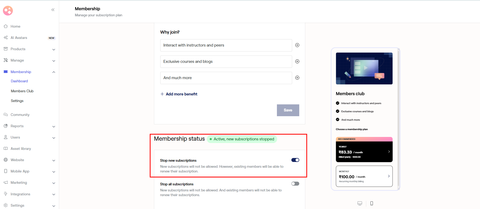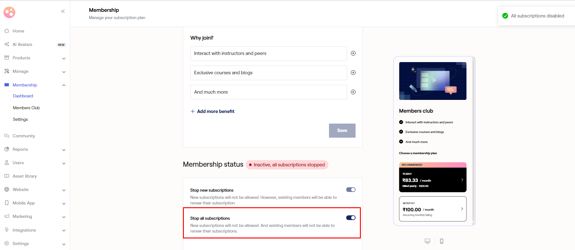 - If Stop all subscription toggle button is on neither new learners will be able to purchase the membership, nor existing members will be able to renew their membership. However, the existing can continue to use the membership until their validity expires.