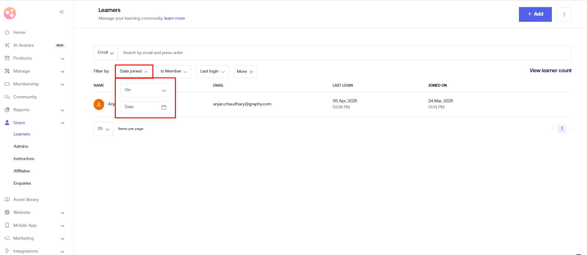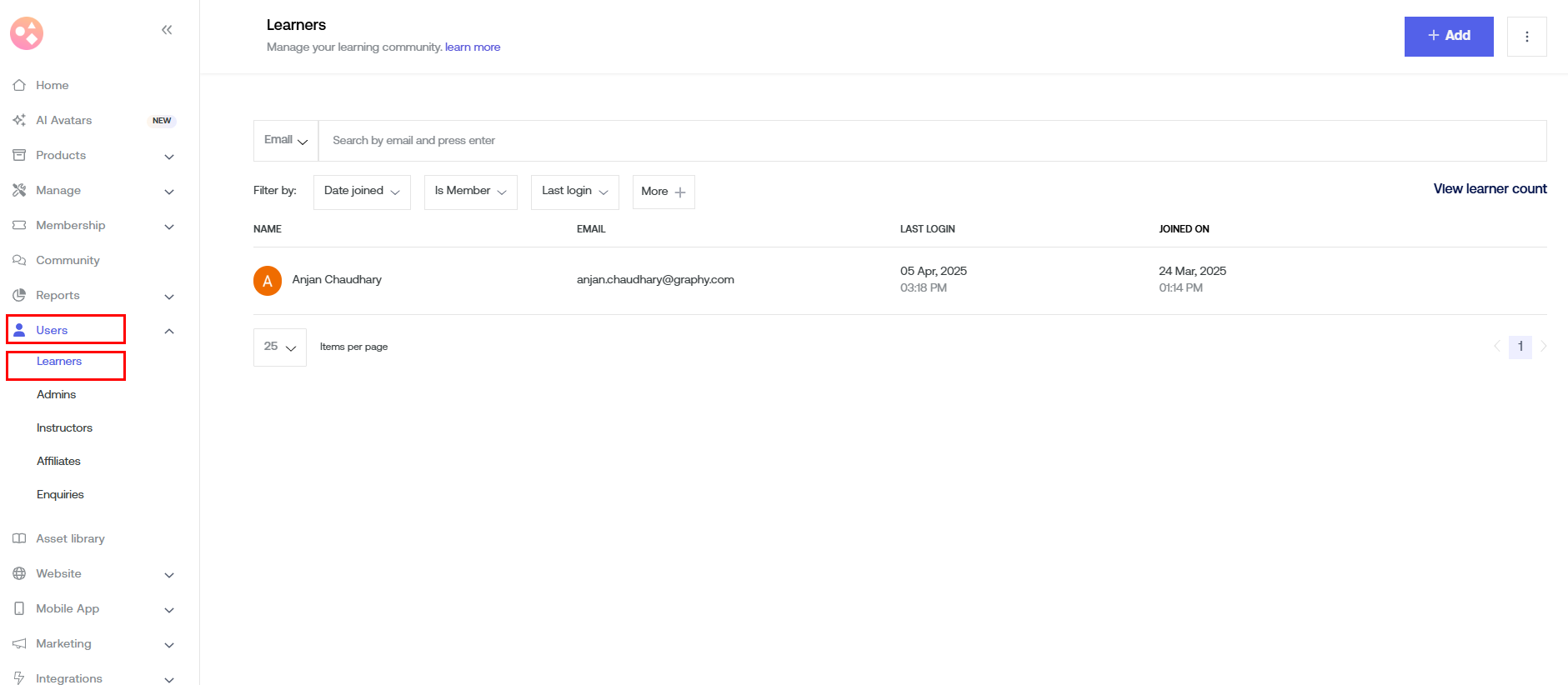 On the landing page, you can view your learners' details by applying various filters. Details will include name, e-mail, their last login as well as actions.
