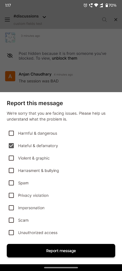 The member can select the reason for reporting the post. After choosing the reason that suits the situation best, they can click on 'Report Message'.