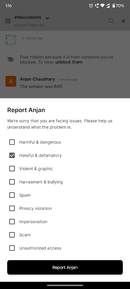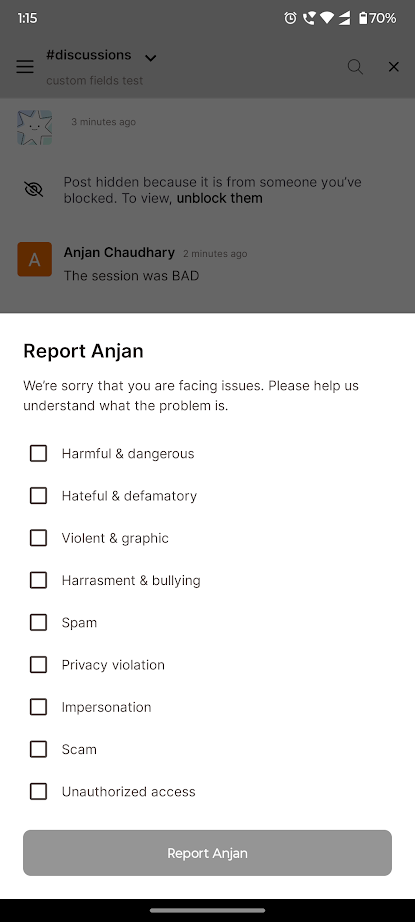 The reporting member can select the reason for reporting their fellow learner. After choosing the reason that suits the situation best, they can click on 'Report Member'.