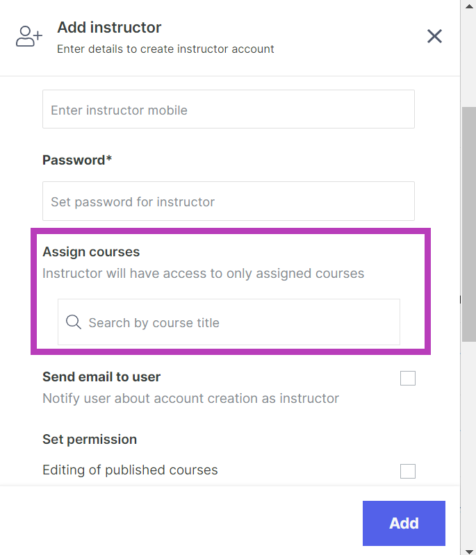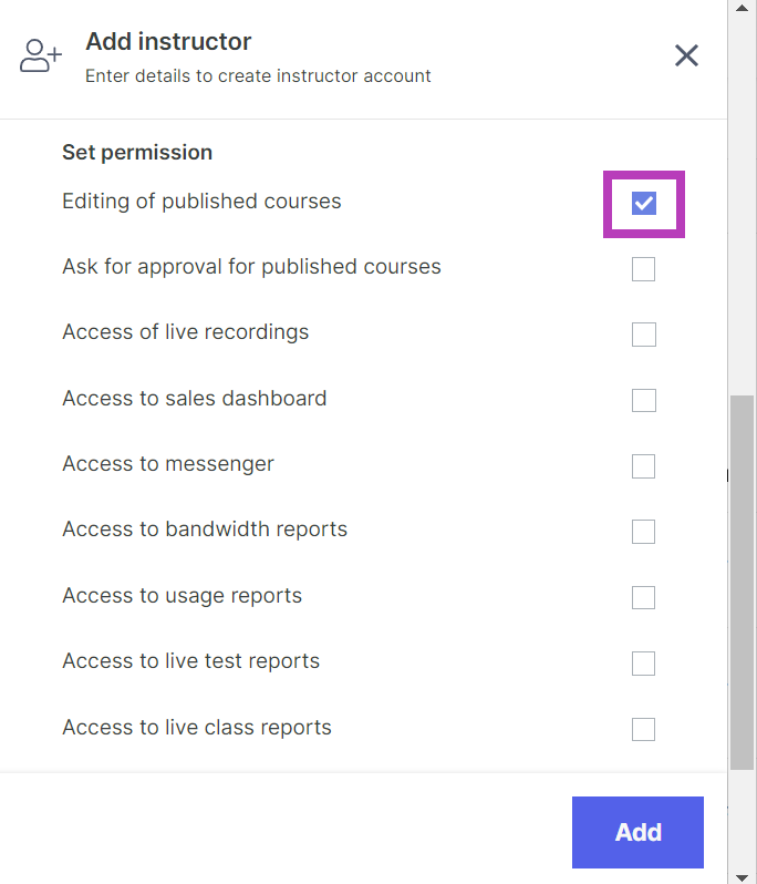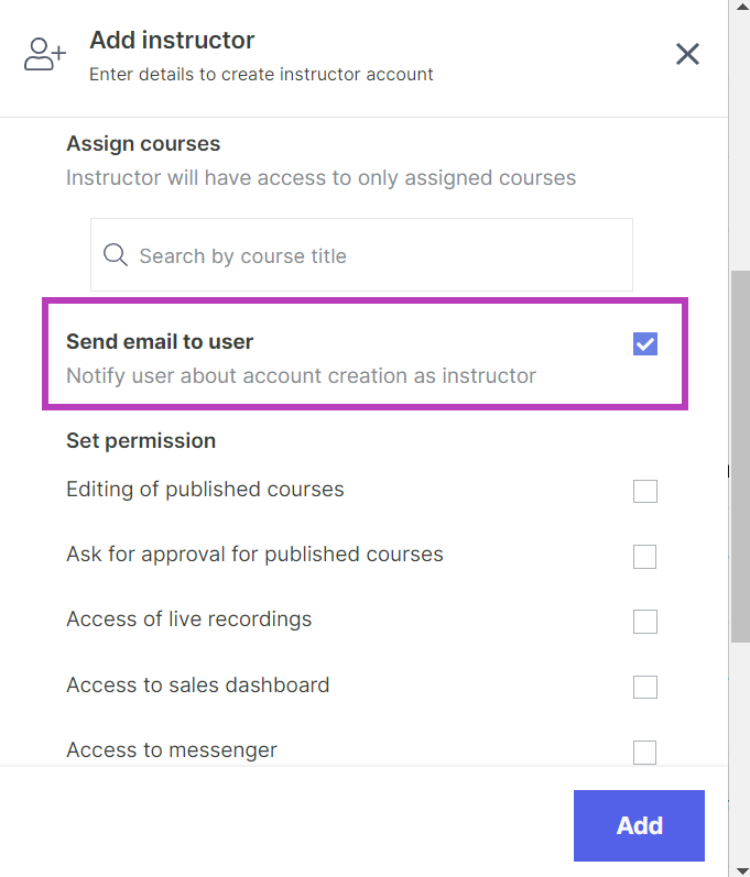 Scroll down and see all the options. Decide where you want to authorize the Instructor and check the boxes beside those options and then, click on the ‘Add’ button.
