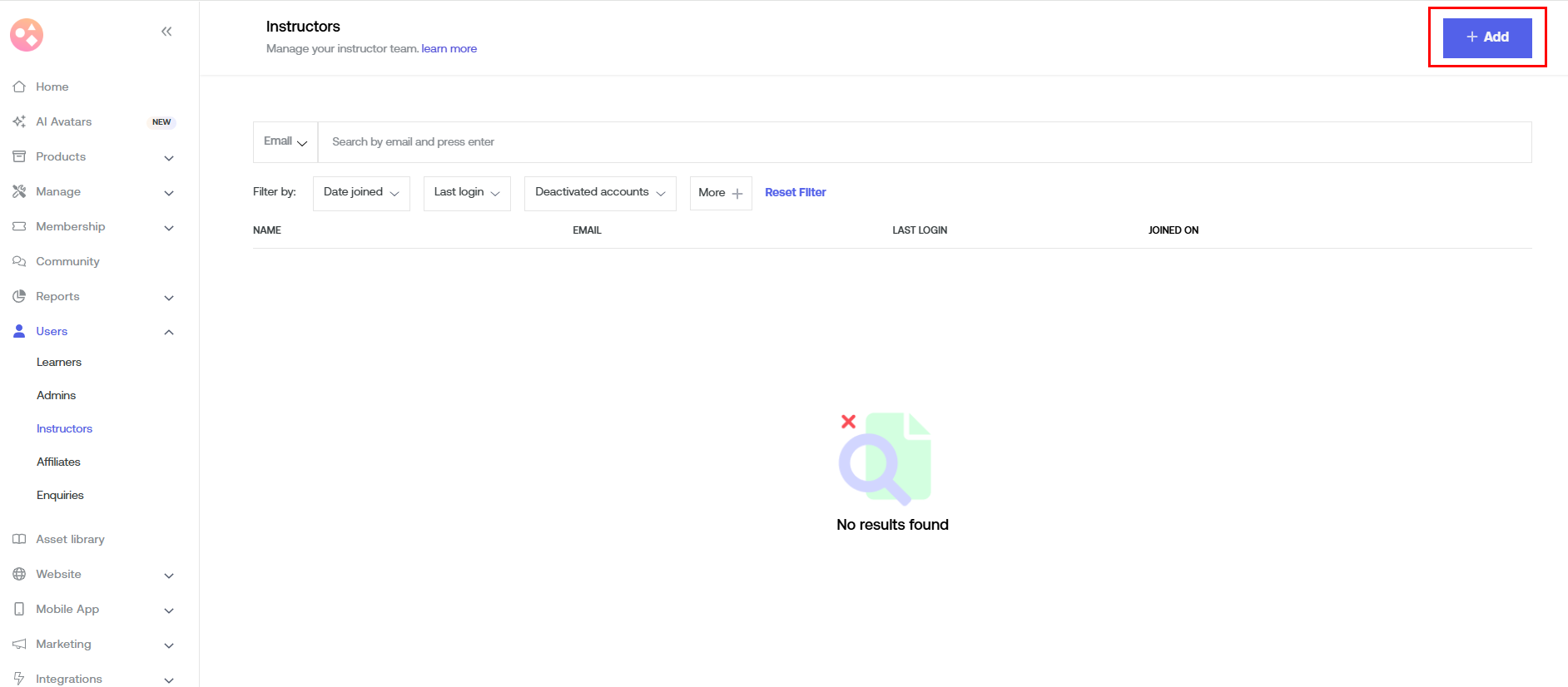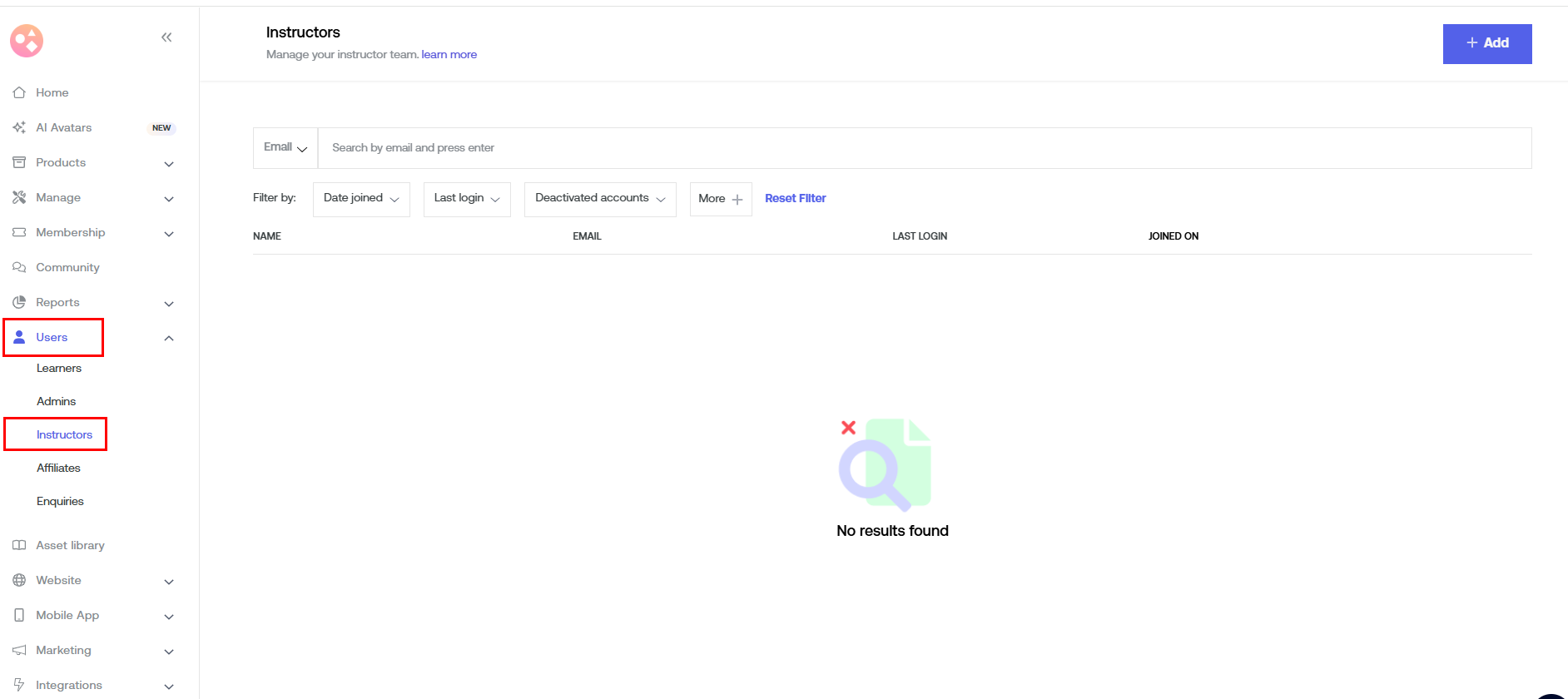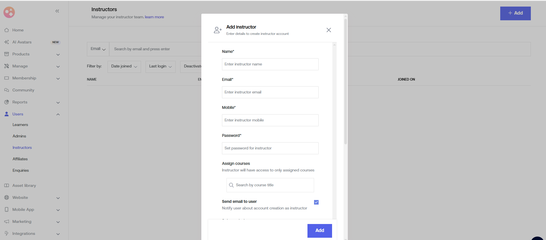 Log in to your Seekhly dashboard and go to Left navbar > Users > Instructors