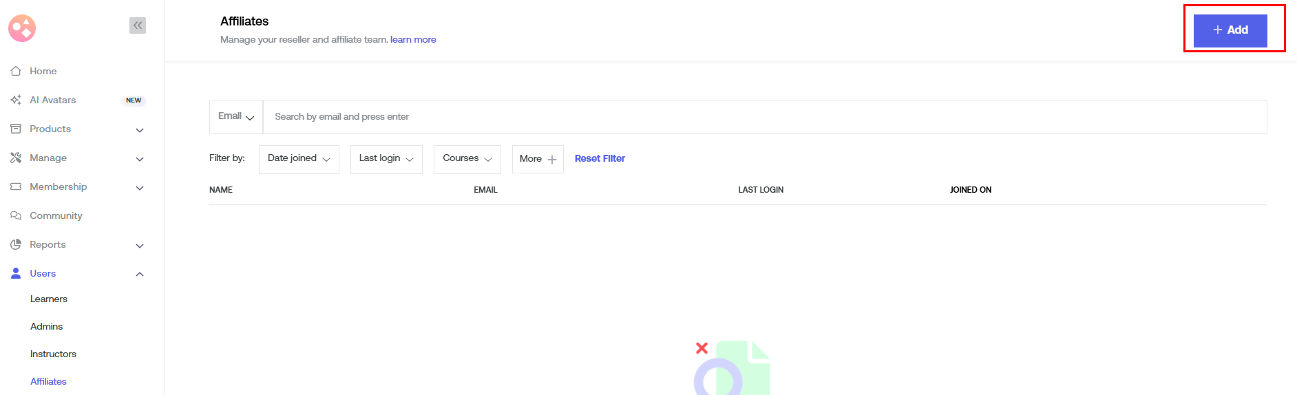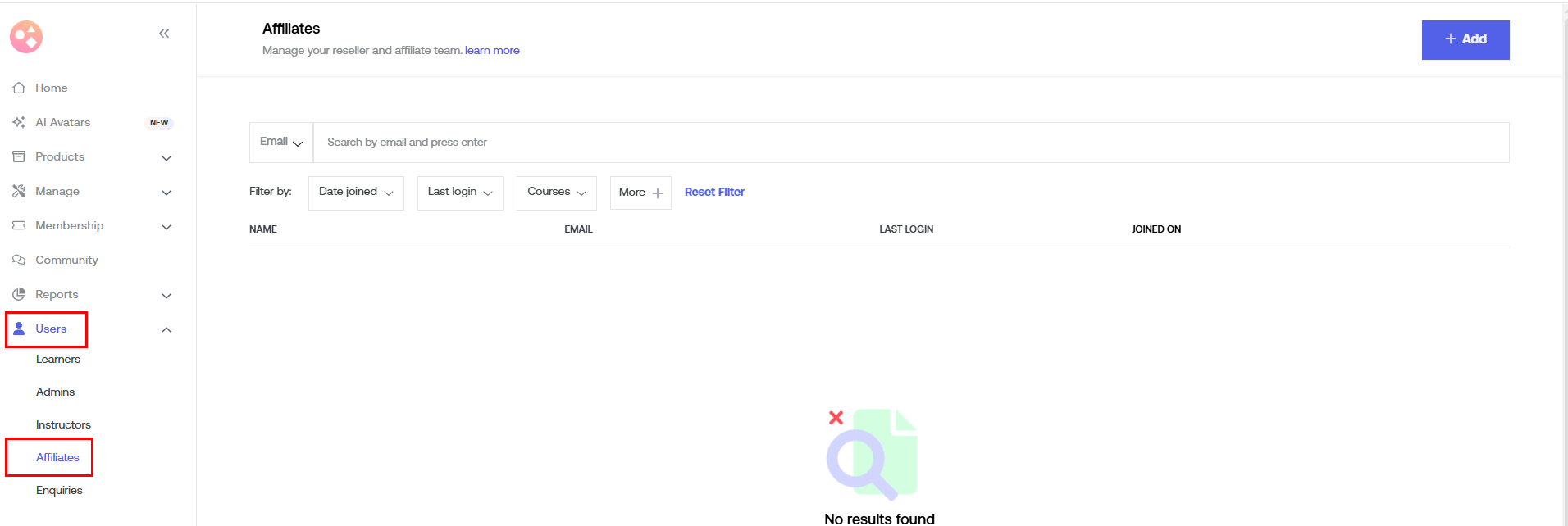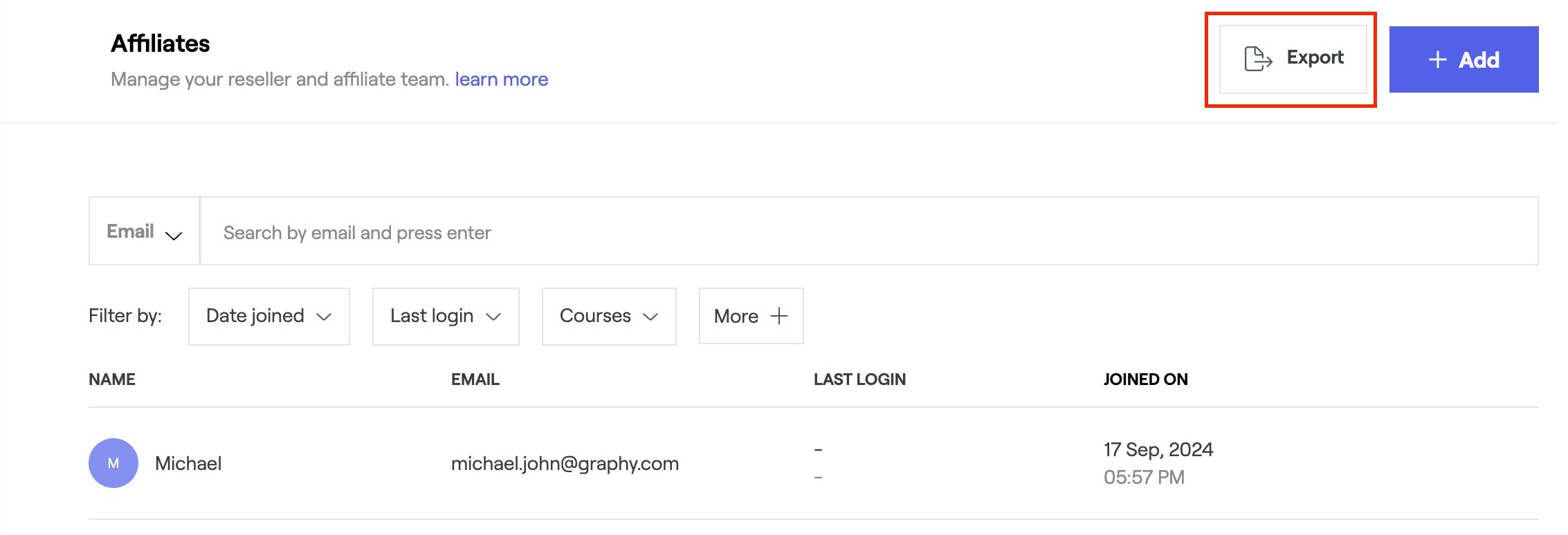 3. To add new affiliates, click on the ‘Add’ button in the upper right corner of your screen.