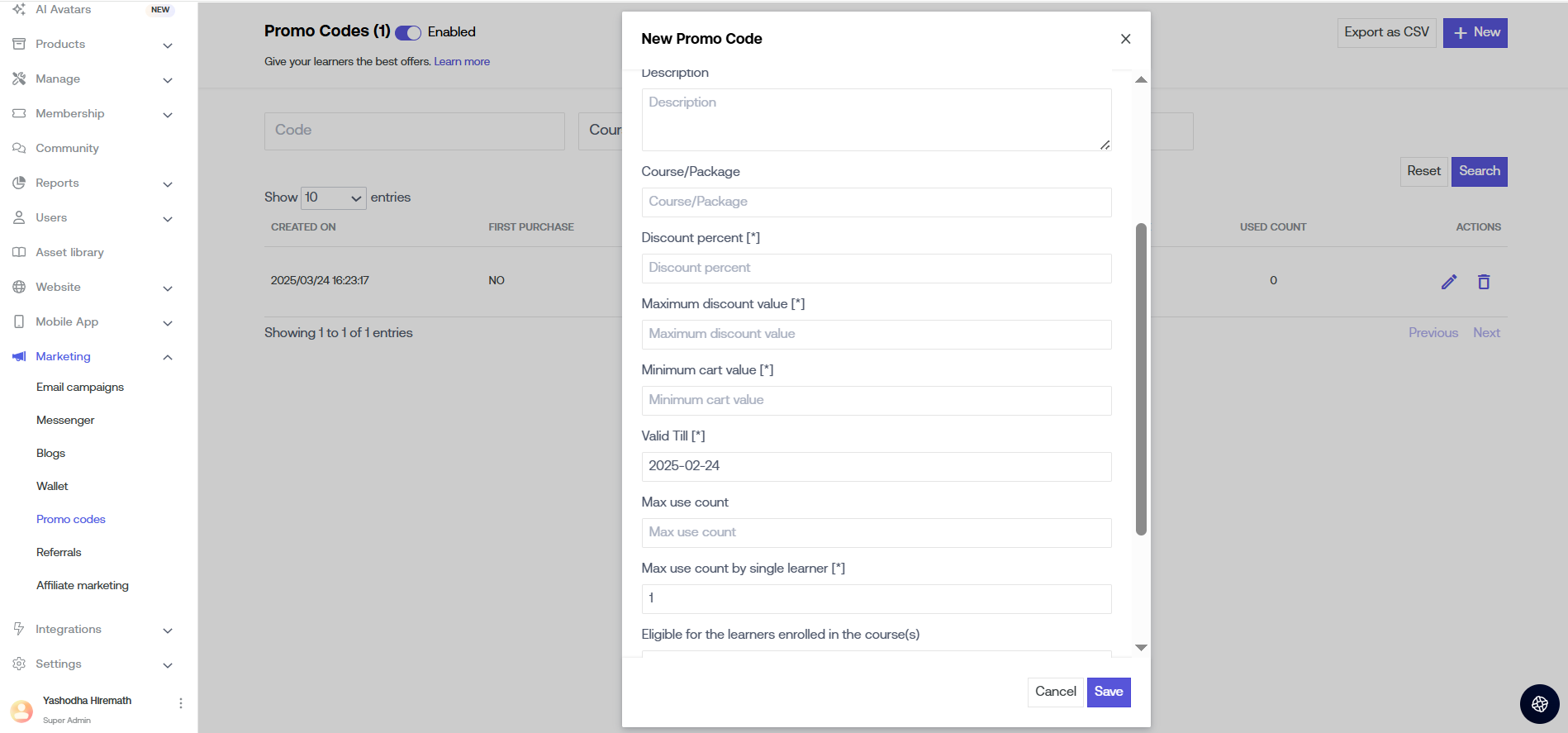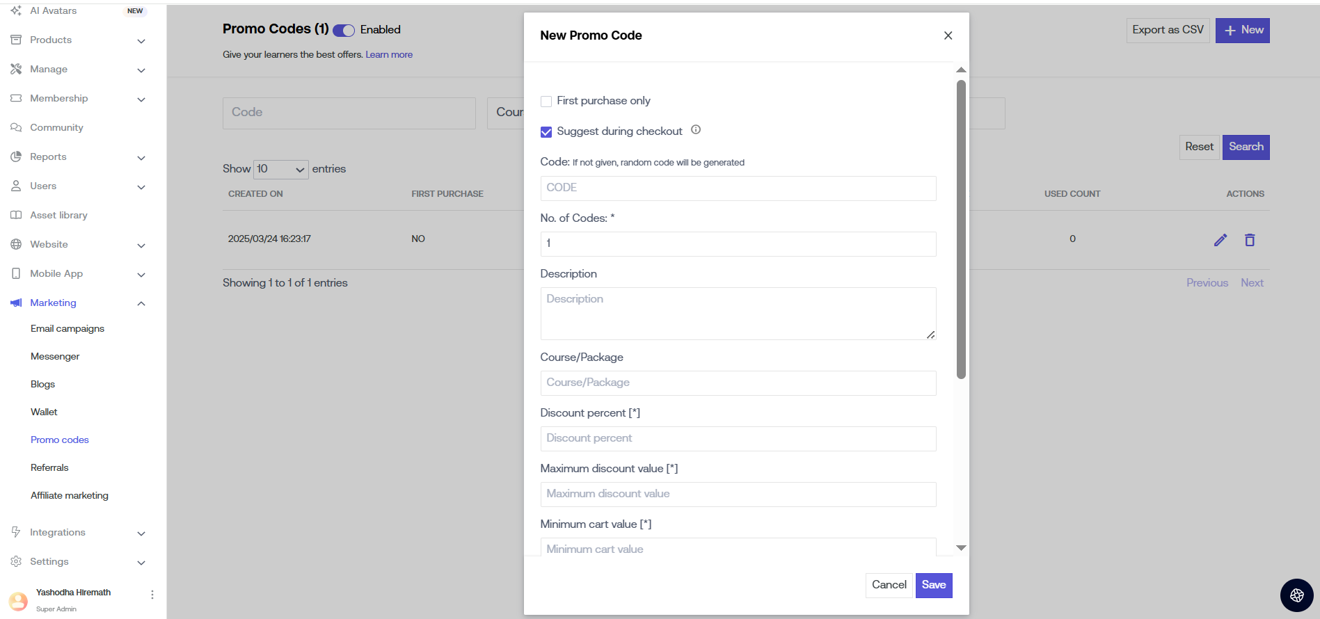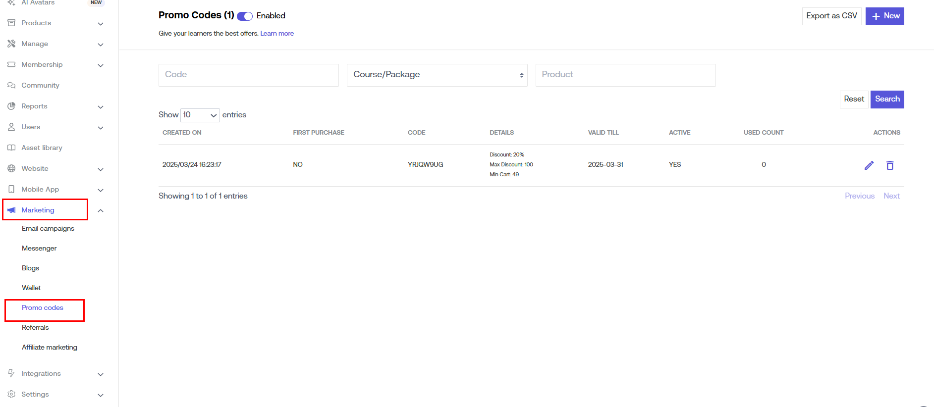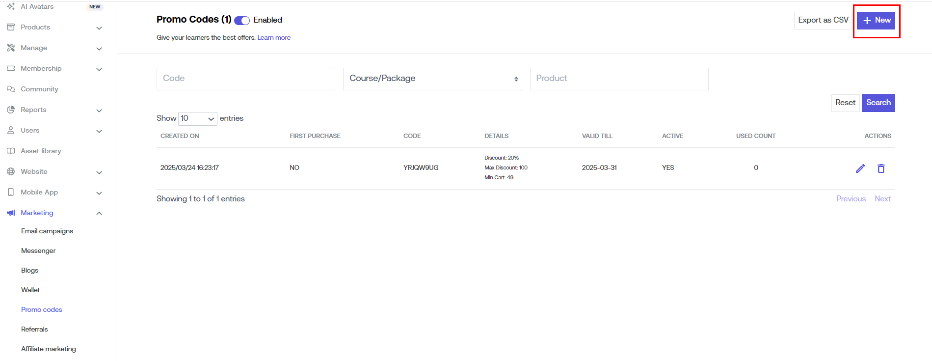 Click on the "New" button to add new Promo Codes.