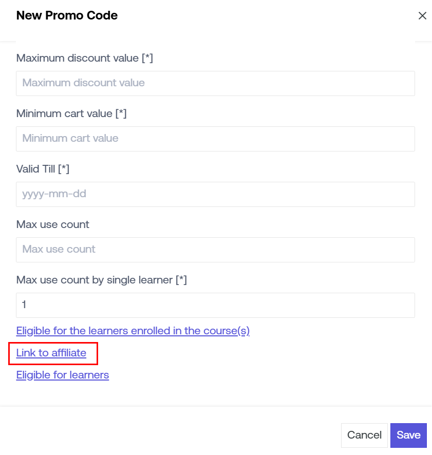 If you have an affiliate, you can link the particular promo code with the specific affiliate. These promo codes would work like affiliate codes using which learners can sign up & get discounts on courses.