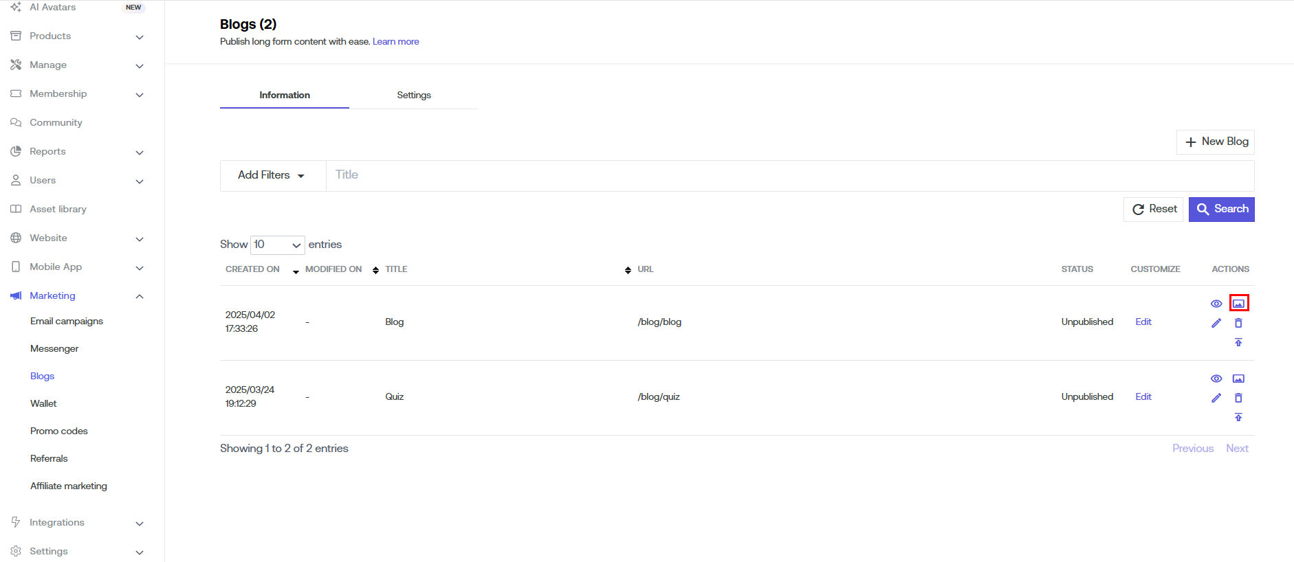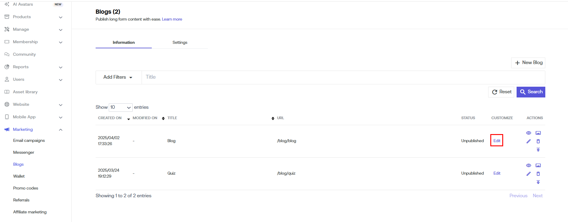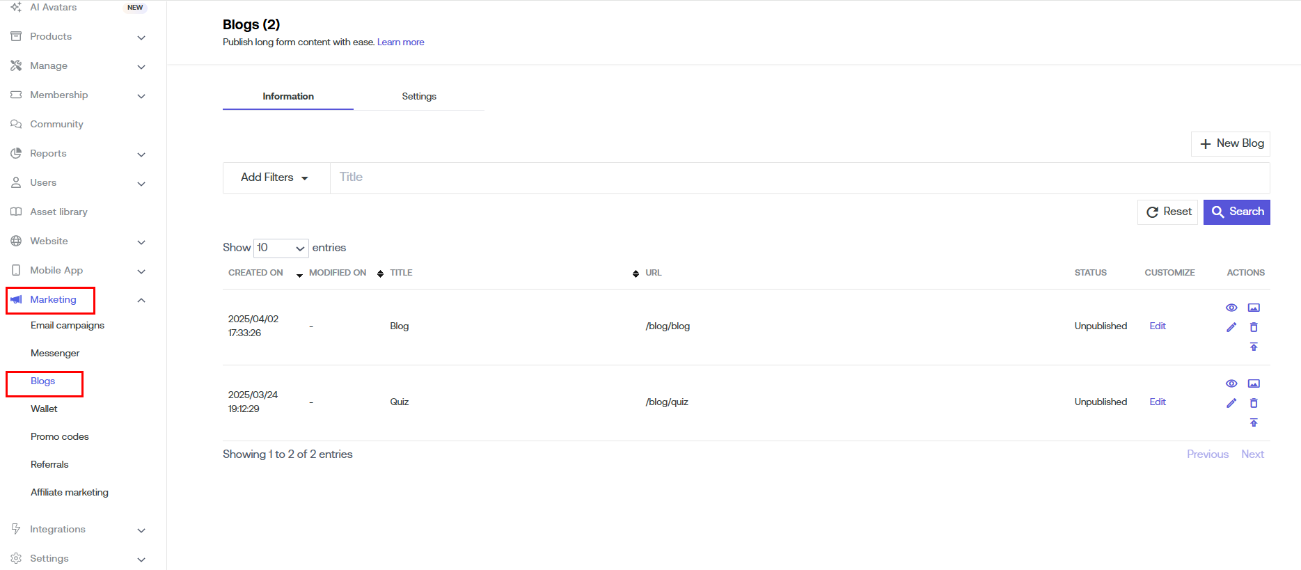 Visit your Dashboard, scroll down and select "Marketing". Here, you can view all the available features. Now, head over to the "Blogs" to explore it in detail.