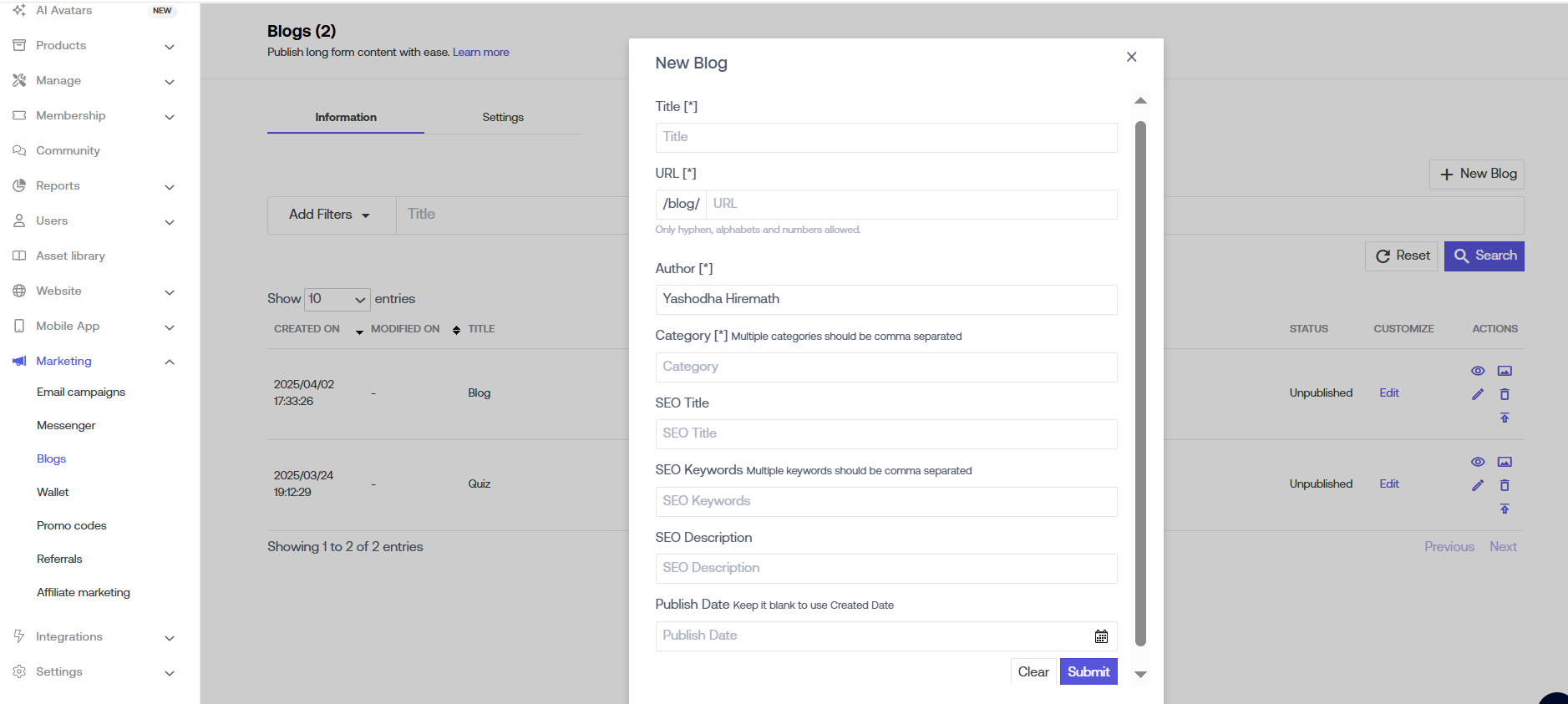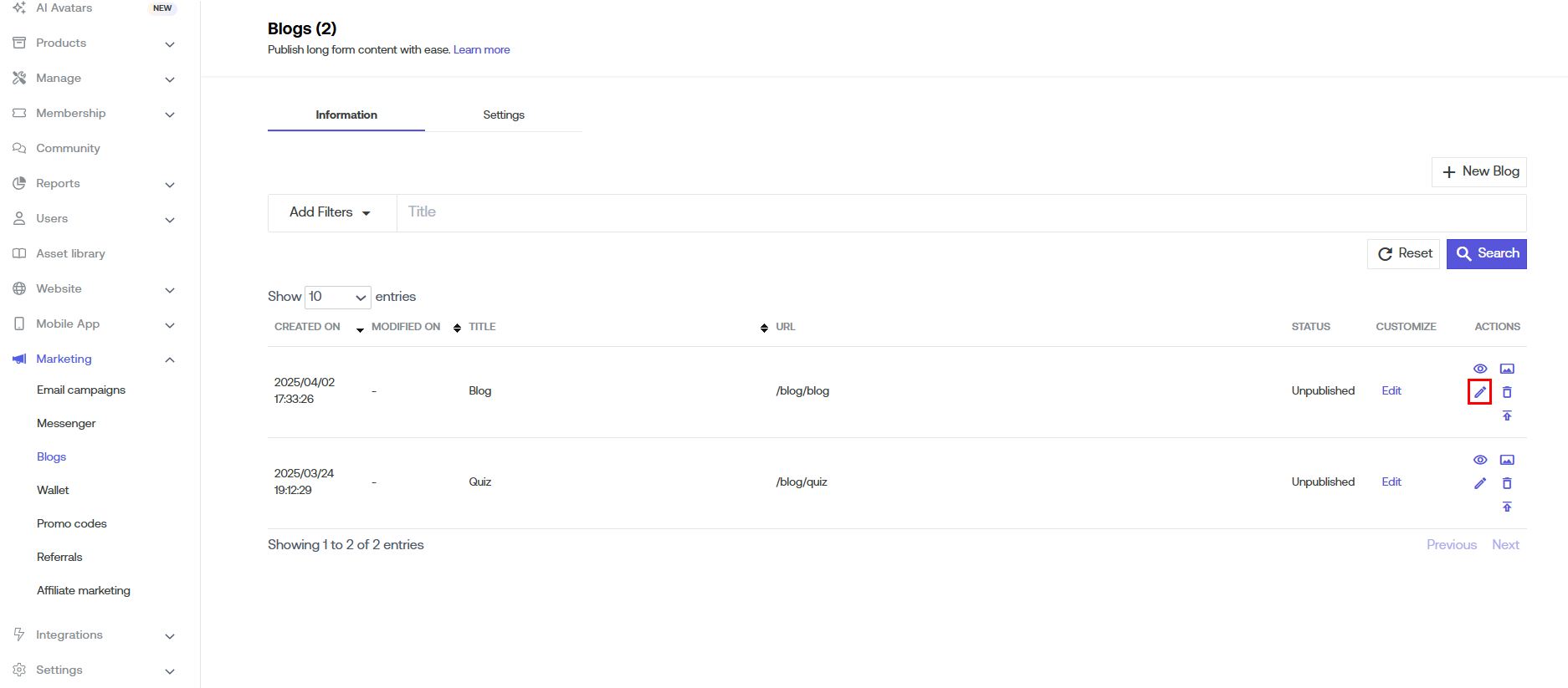 Under "Blogs" you can create new blogs as well as view & edit all the details of your existing blogs posted in one place.