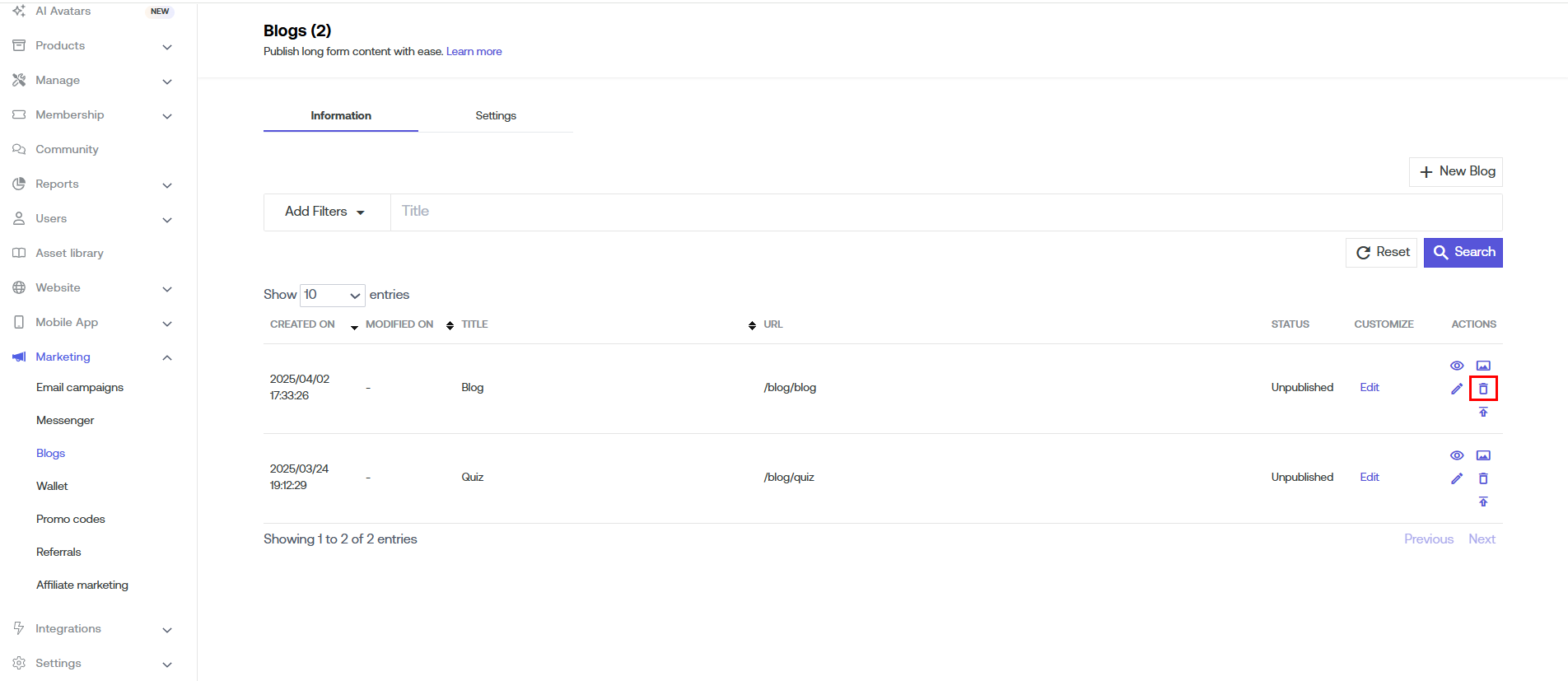 Whether published or unpublished, you can delete any of the blogs that you have created by using the delete icon.