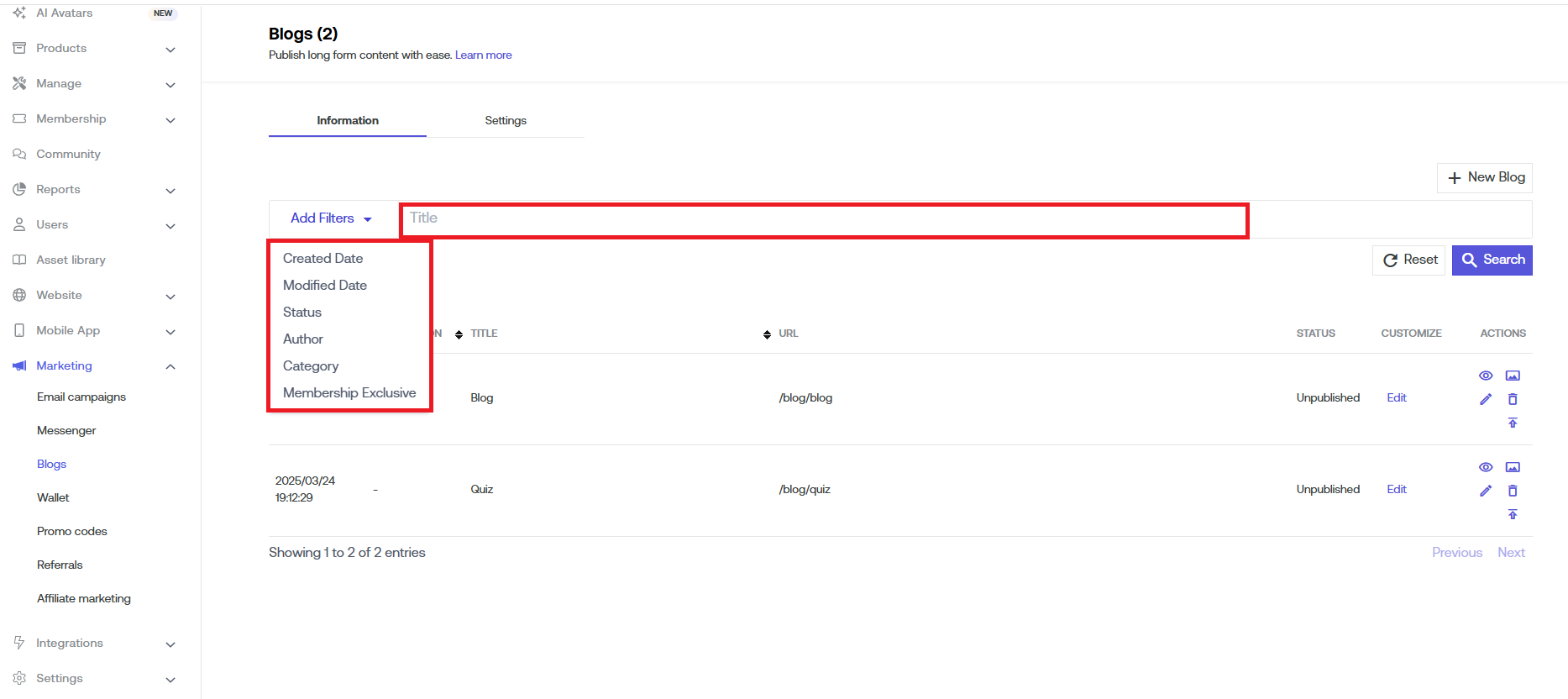 Example: If you are looking for a blog which was uploaded recently, you can scroll through all the pages to find it. But, that seems to be a time-consuming task, especially when there are multiple pages. Therefore, you can apply the "created date" as well as the "author" filter. Blog listing will be narrowed down and you will be able to identify the blog immediately.