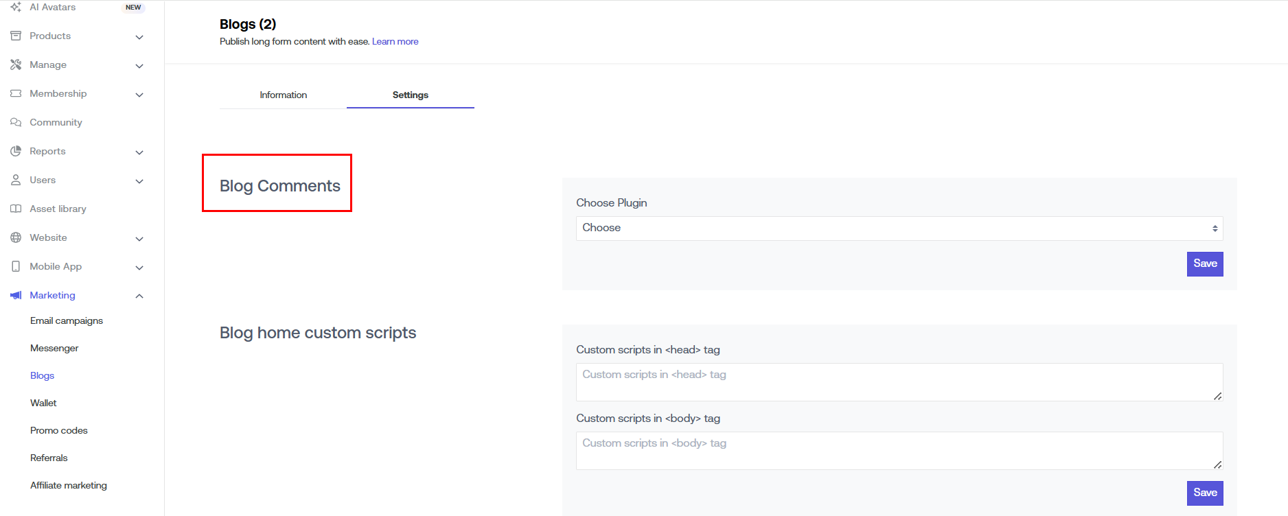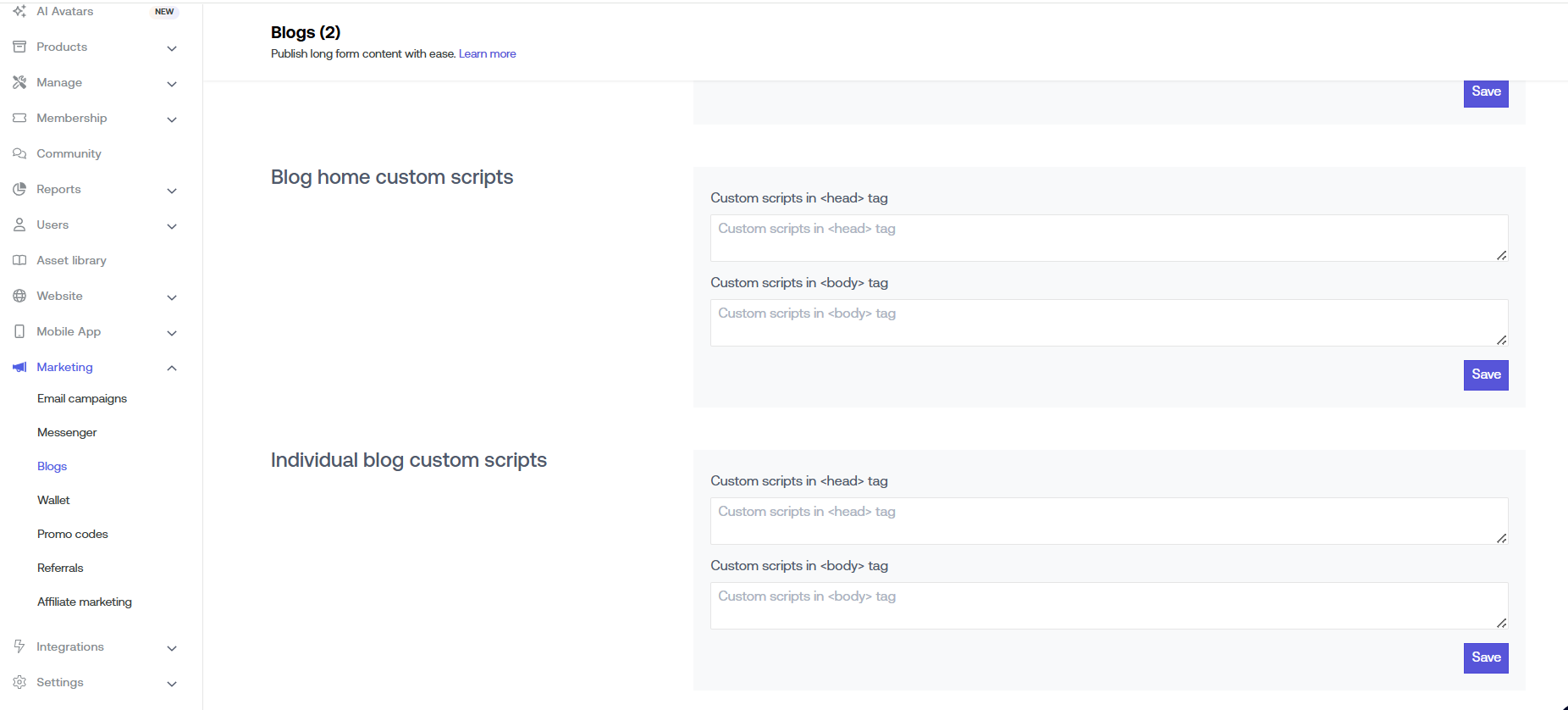 The custom scripts that you add here will go to all the blog posts on your course platform's blog section.