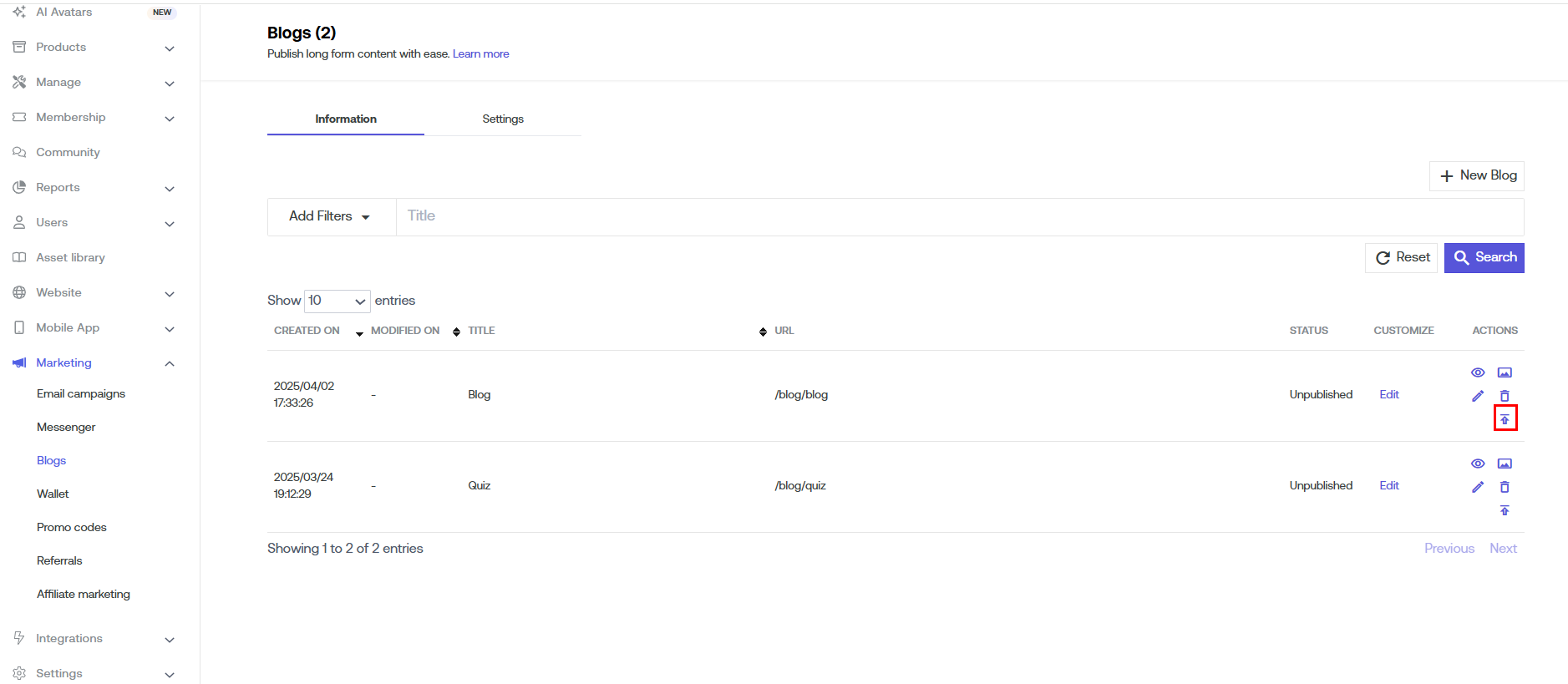 Click on the "publish" icon under Actions to publish the blog. Once you click on the icon, your blog will be automatically published.