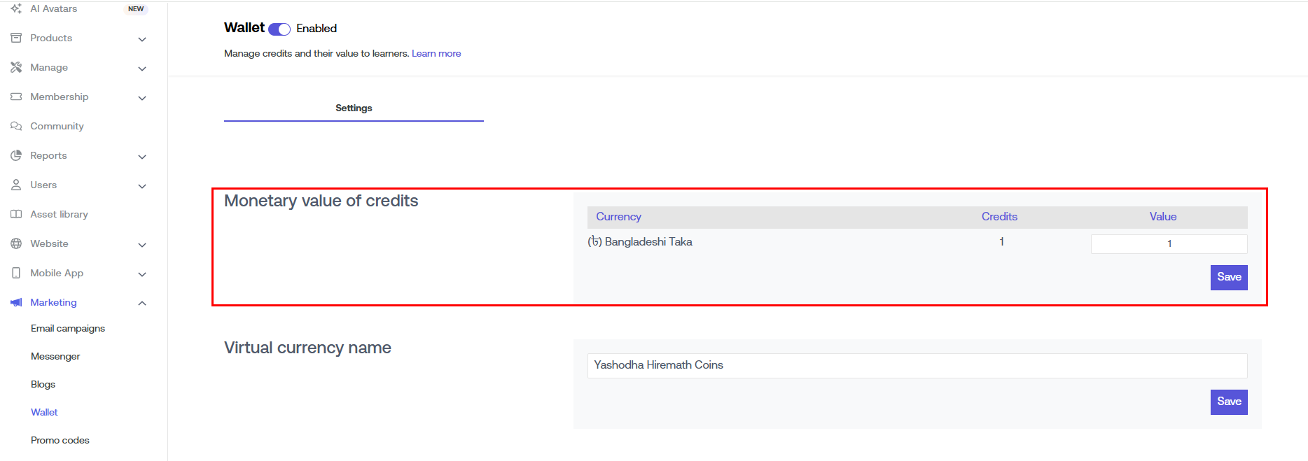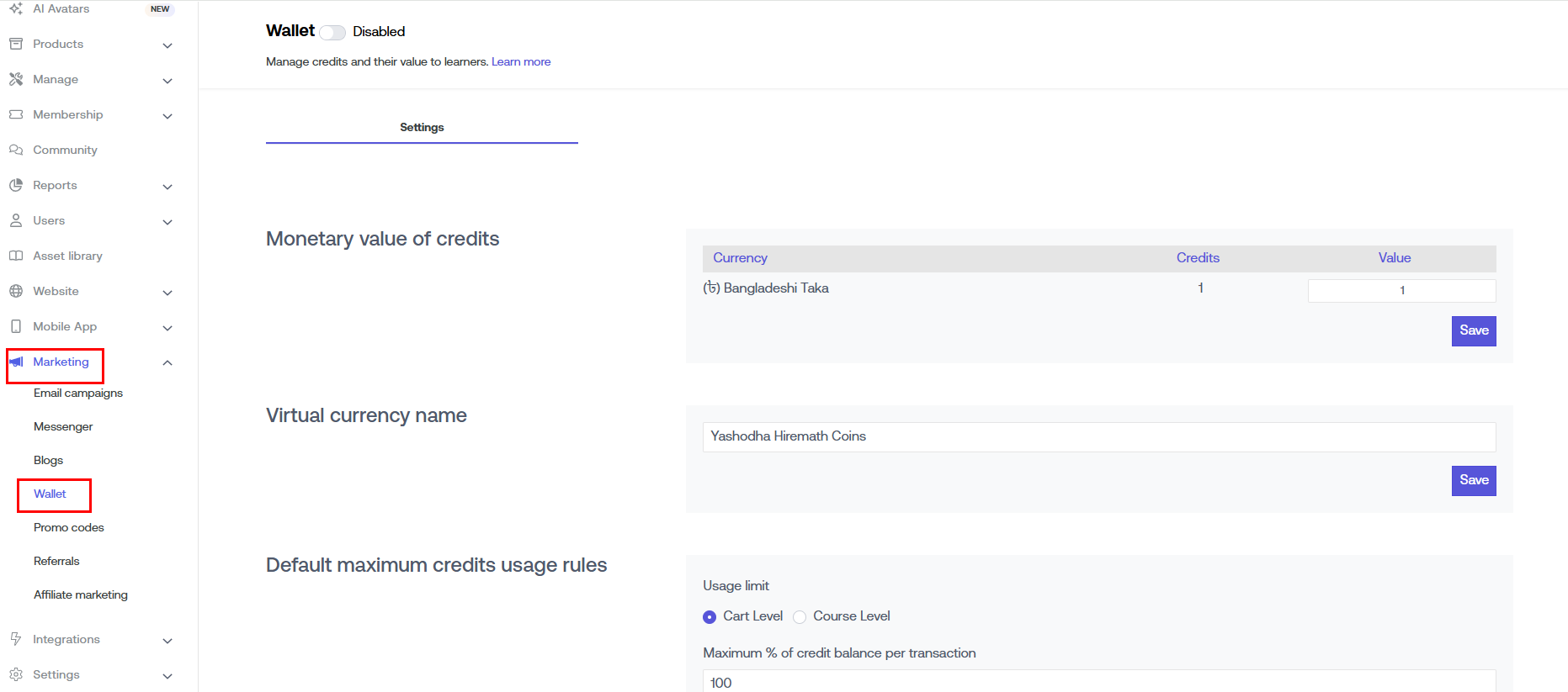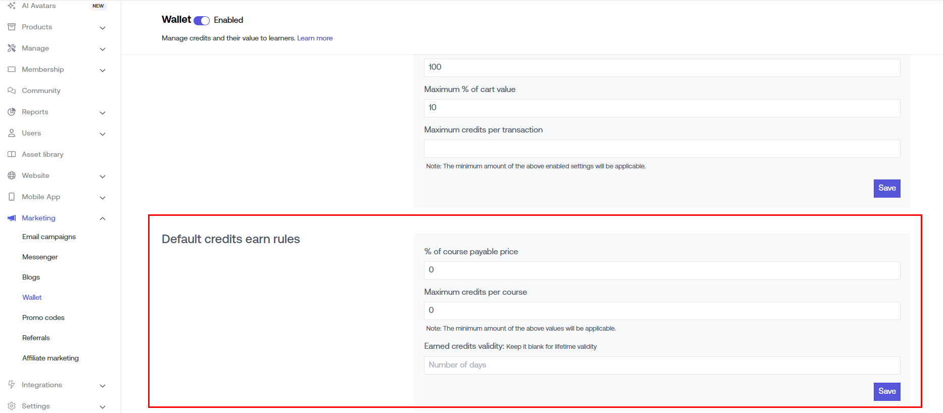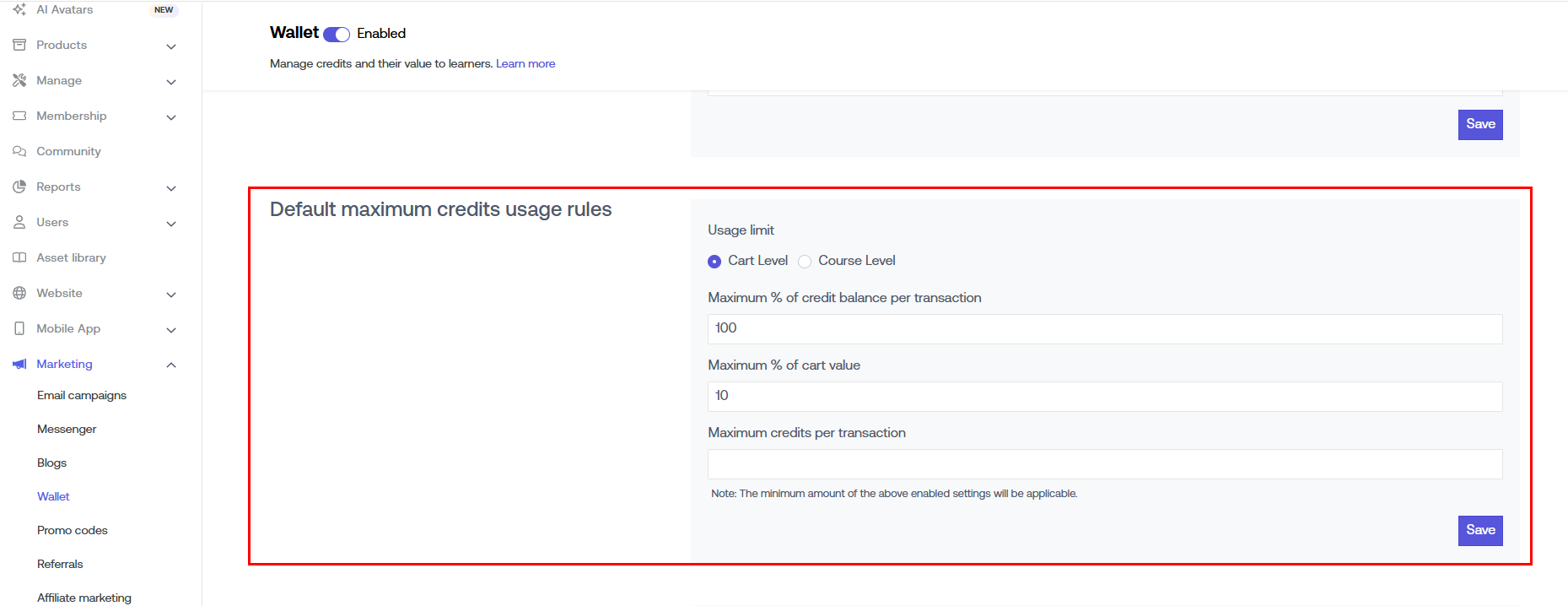 Example: If the learner has 500 credit values in his wallet. You have set 20% here, then then the learner can redeem 100 credits at most, per transaction.