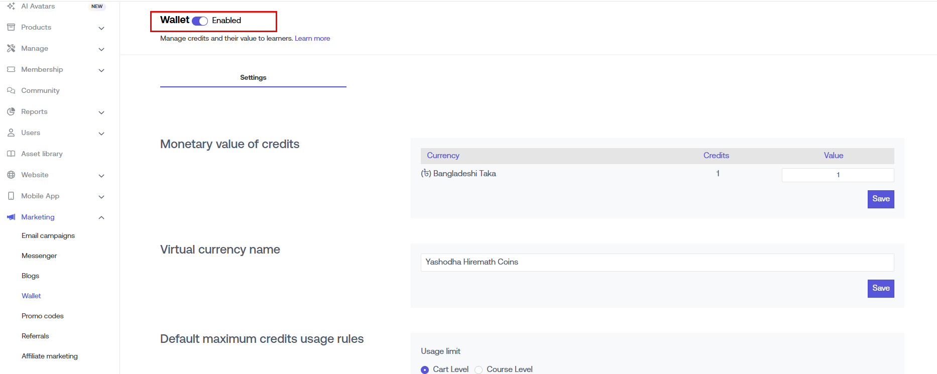 If you don't want this feature on your platform you can turn it off. To enable or disable the "Wallets" feature click on the toggle button.