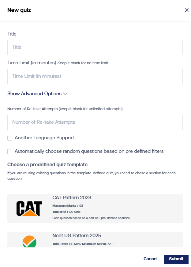 No. of Re-takes Attempt- You can give liberty to the learners to attempt a quiz multiple times. Just select the number of times you want to allow them to attempt the quiz. You can leave this space blank if you don't want to restrict the number of times they appear.