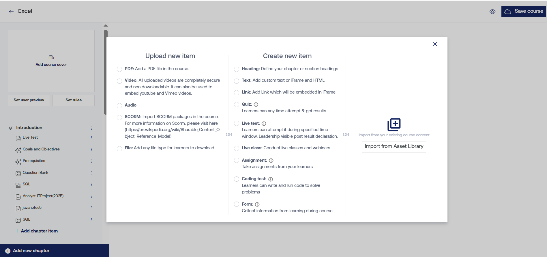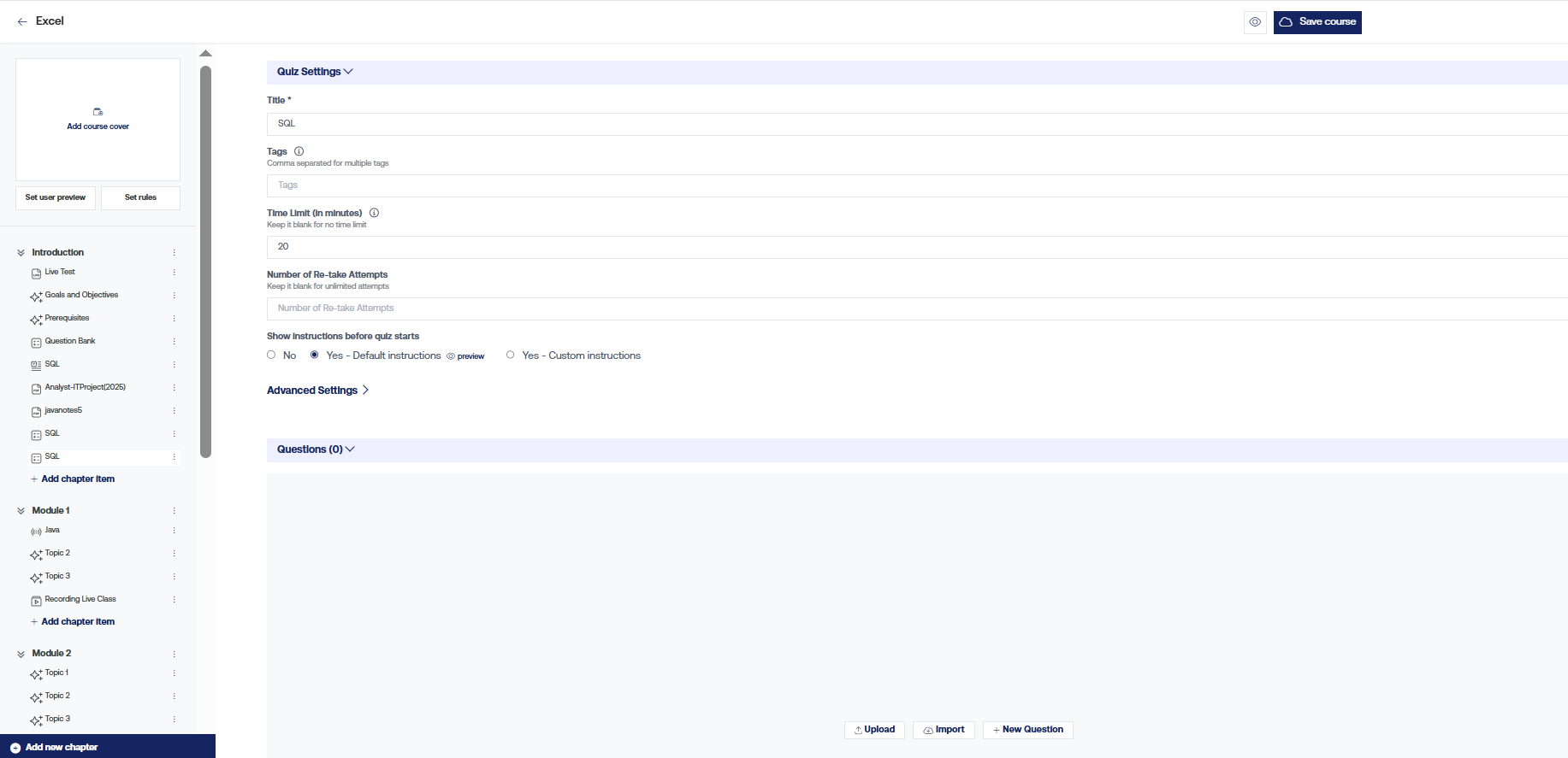 Log in to the platform and click on the Courses available in the left navigation. Now click on the Course tab. Open your course in Course Builder and click on create a Add chapter item, then select "Quiz". Now enter the title, time limit & no of attempts allowed to get started.