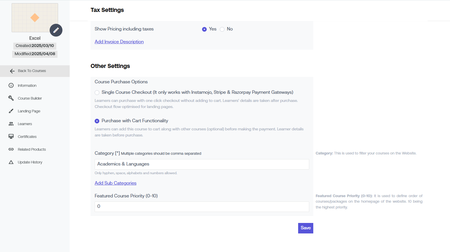 Go to the “ Products > Courses > Details” page and click on the details icon to proceed. Click on the "Pricing" tab on top to enter course pricing details.