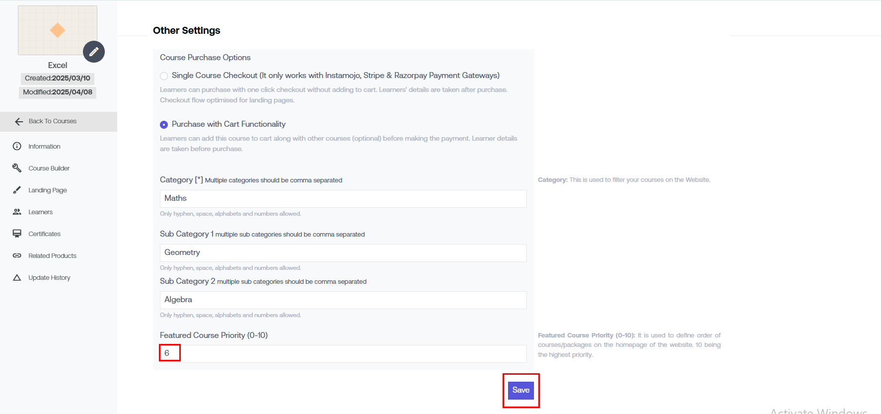 Example: If the course is about "Algebra", you can categorise it under "Maths".