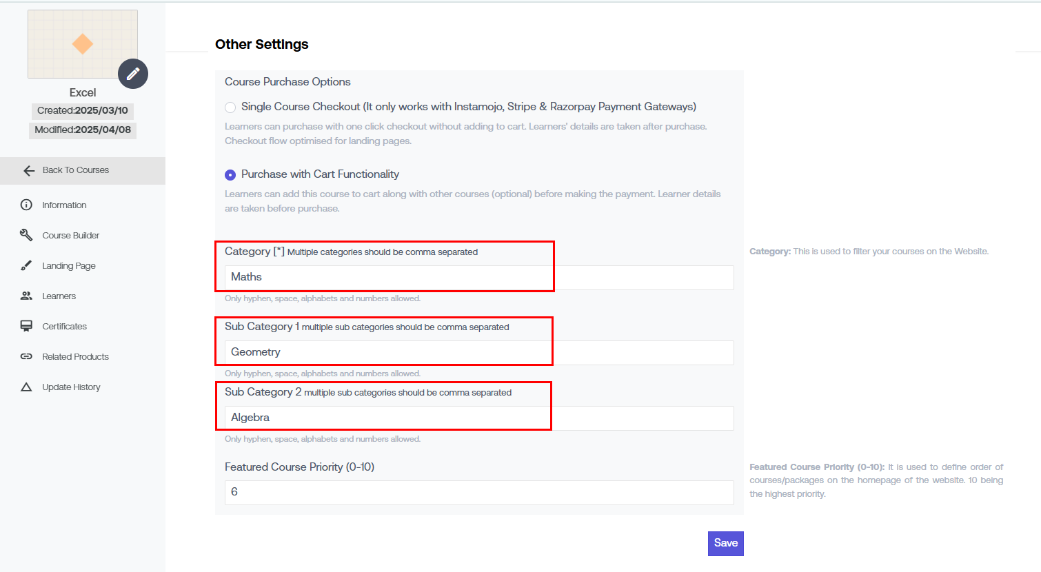 Example: If the course is about "Algebra & Geometry", you can write "Geometry" as Sub Category 2.
