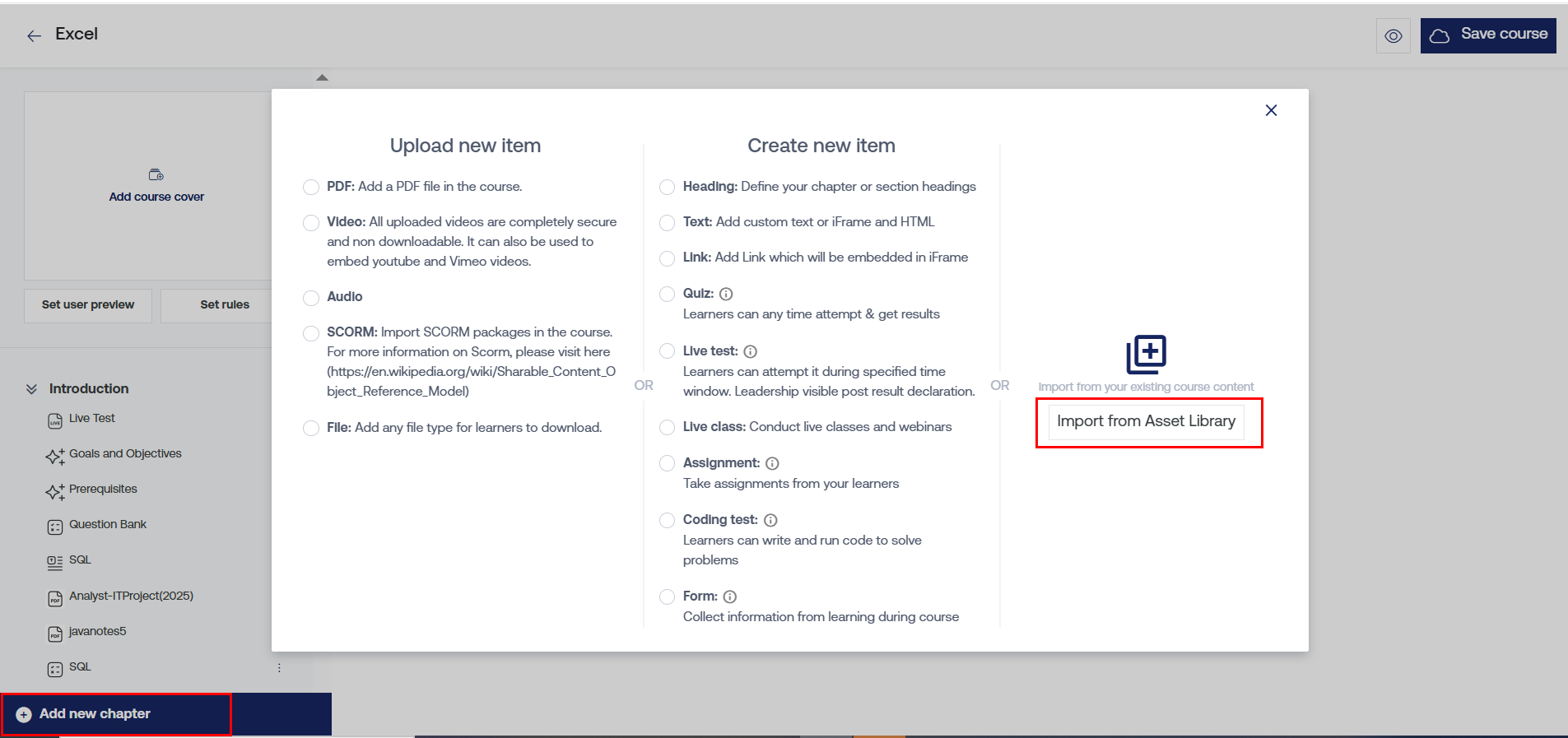 Since you want to create a new course by using the previously uploaded items, click on the ‘Import from Asset Library’ from the options available to you.
