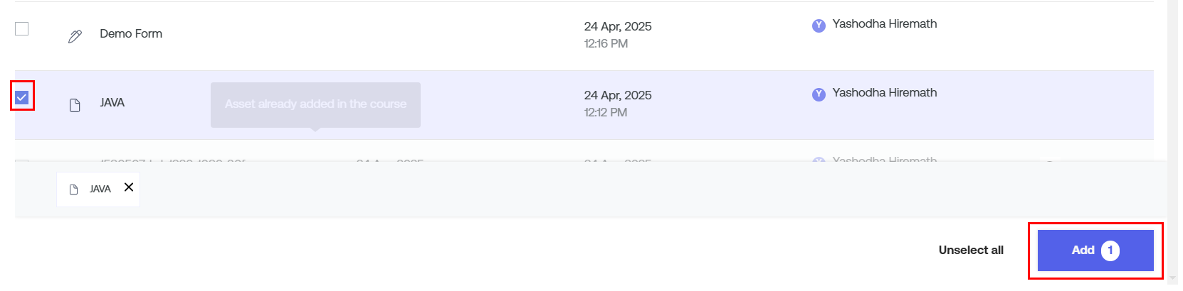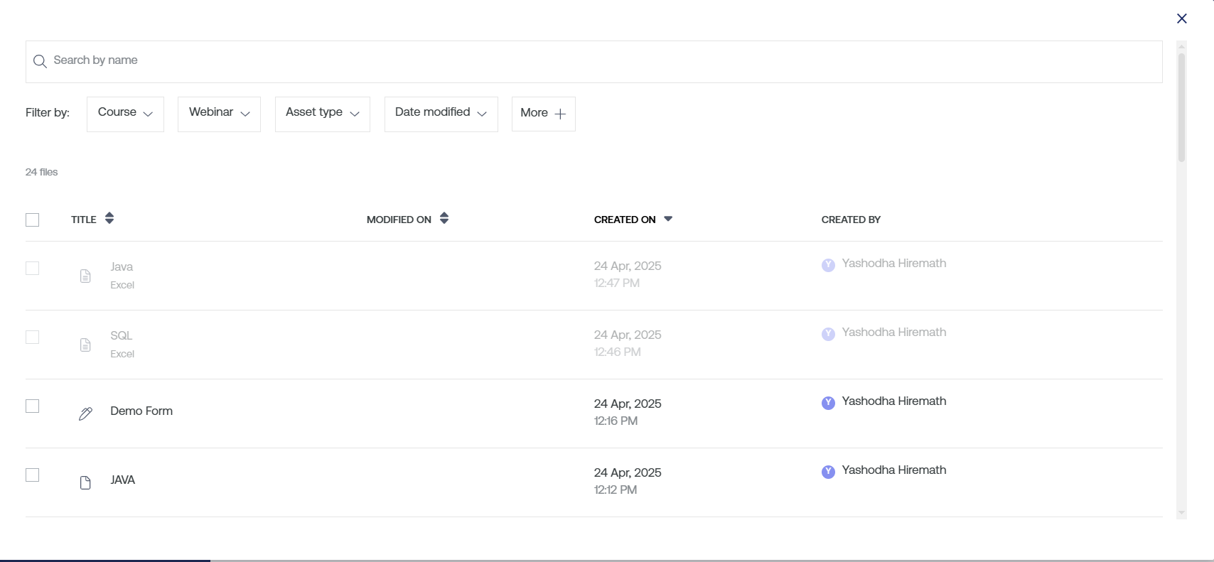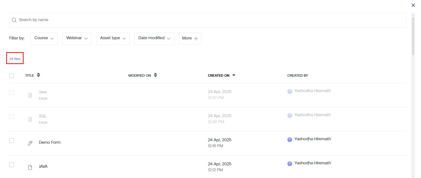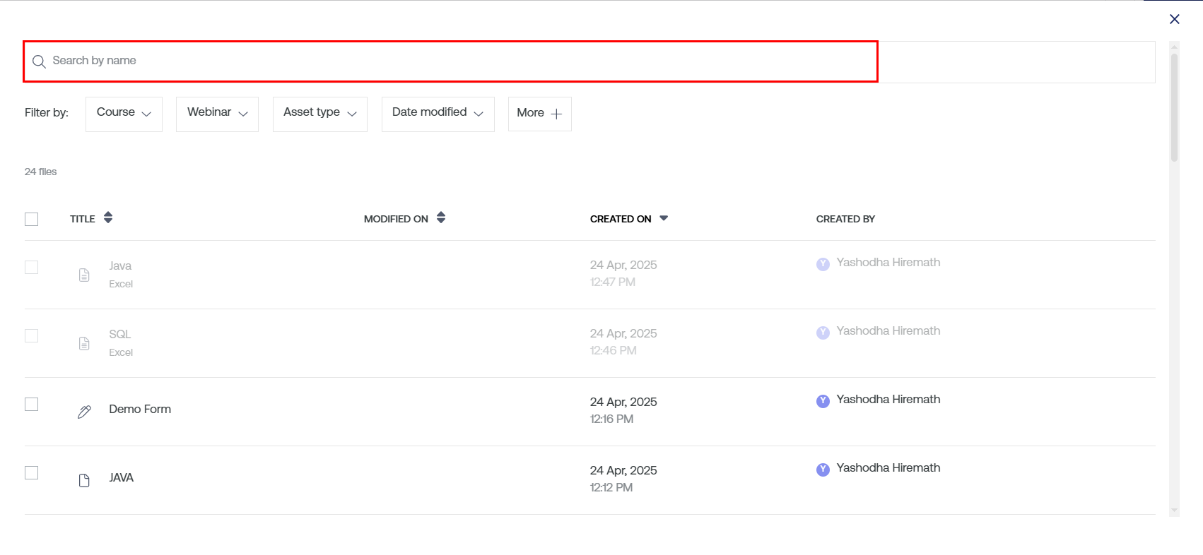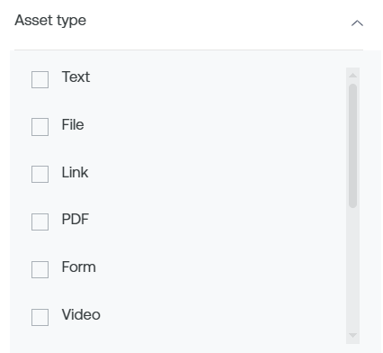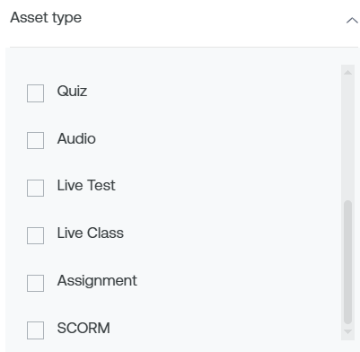 Asset Type: This filter gives you the option to choose the type of asset that you want to add to your new course. It could be a video, audio, PDF, SCORM, and others.