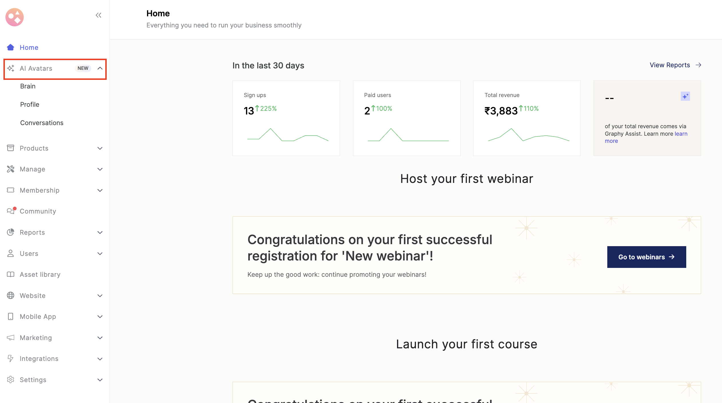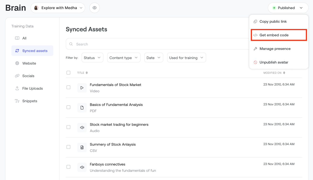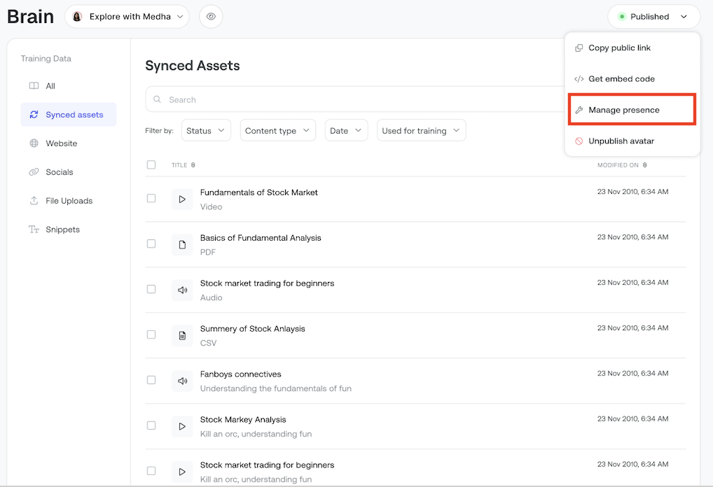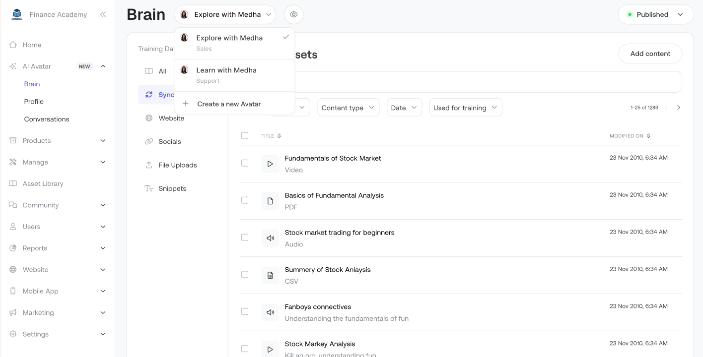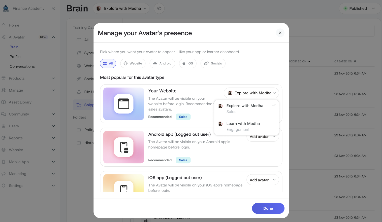 - Navigate to AI Avatars from the left navigation bar and click on Brain.