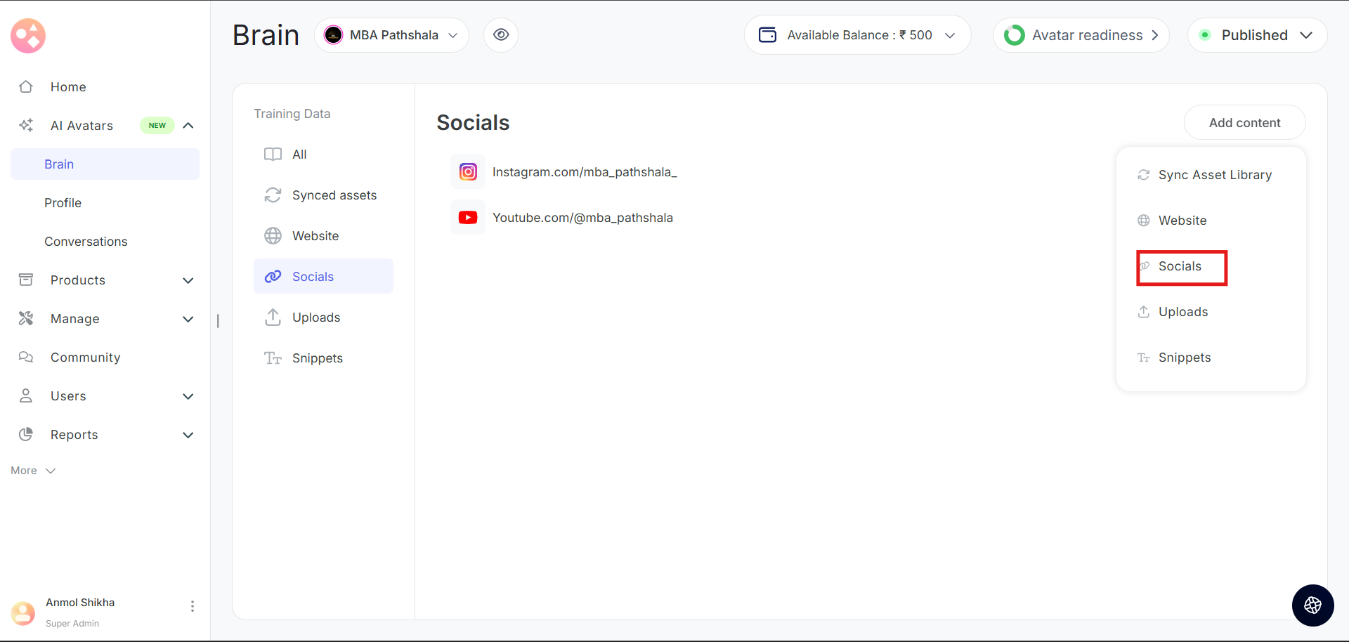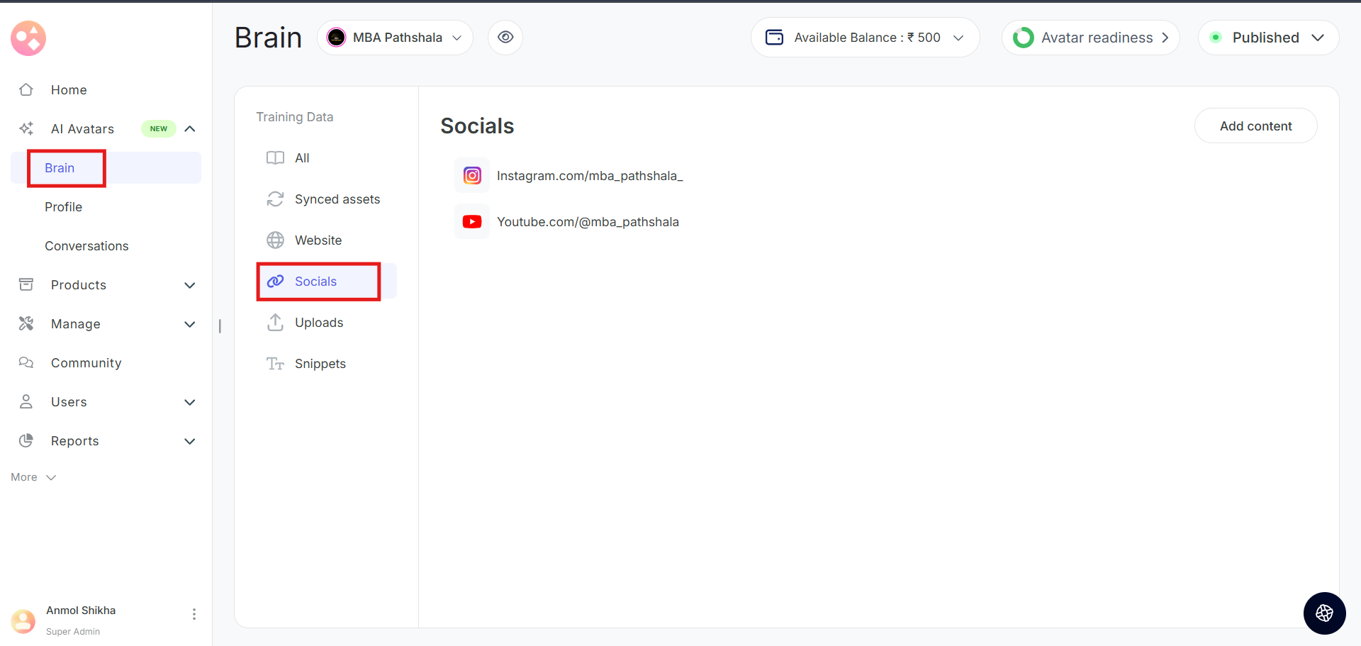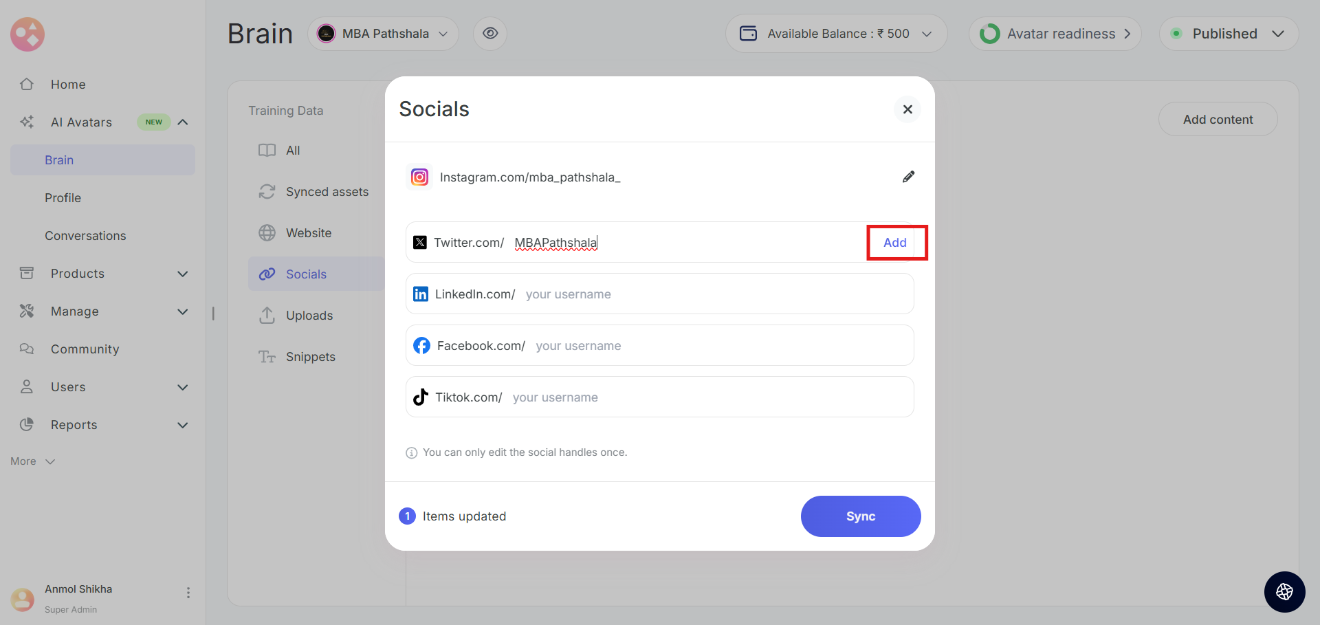 Step 5: Click Add and then Sync to complete the connection. Your Avatar will immediately begin learning from your public content.