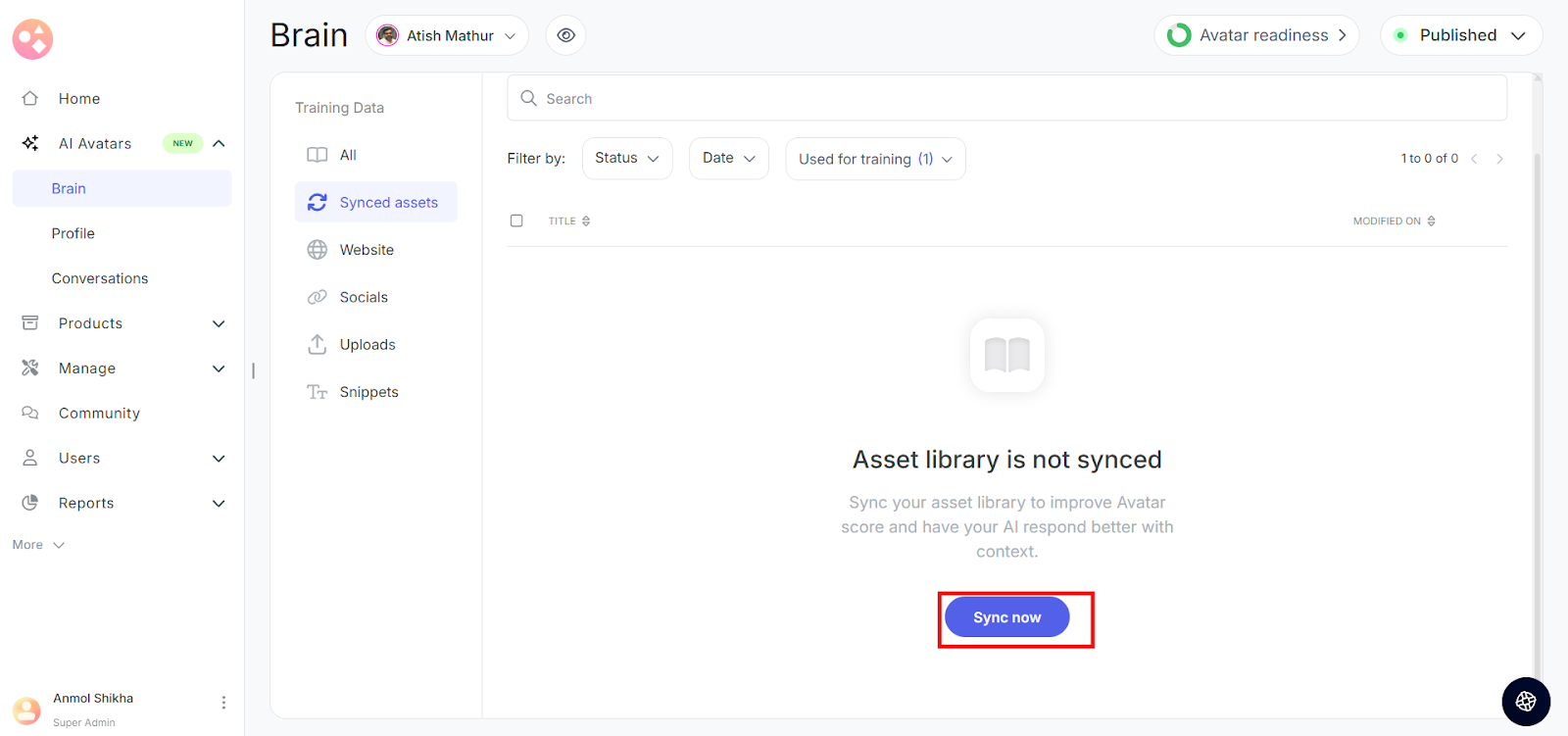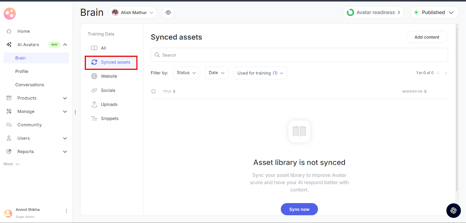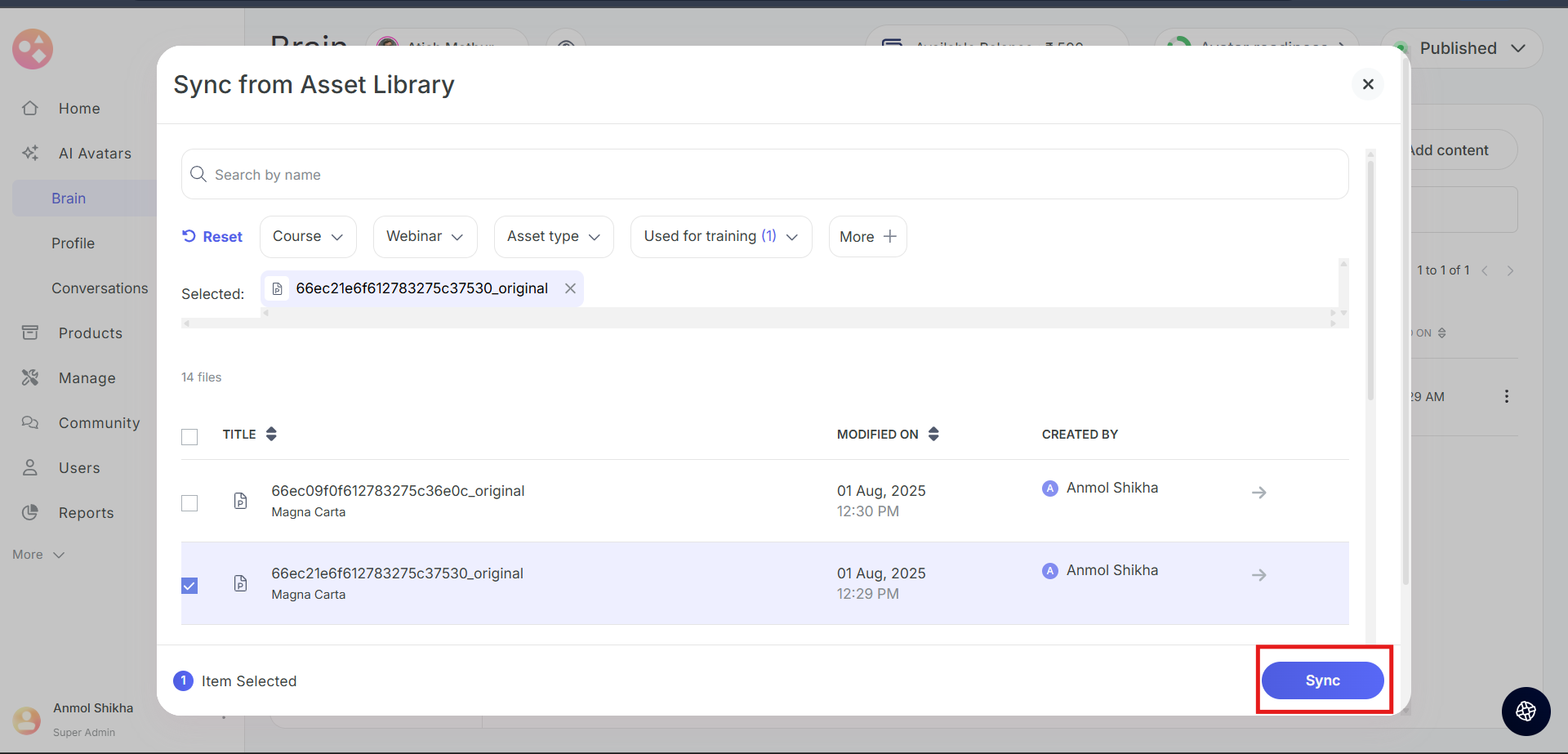 Select the content you want your Avatar to get trained on and click on Sync.
