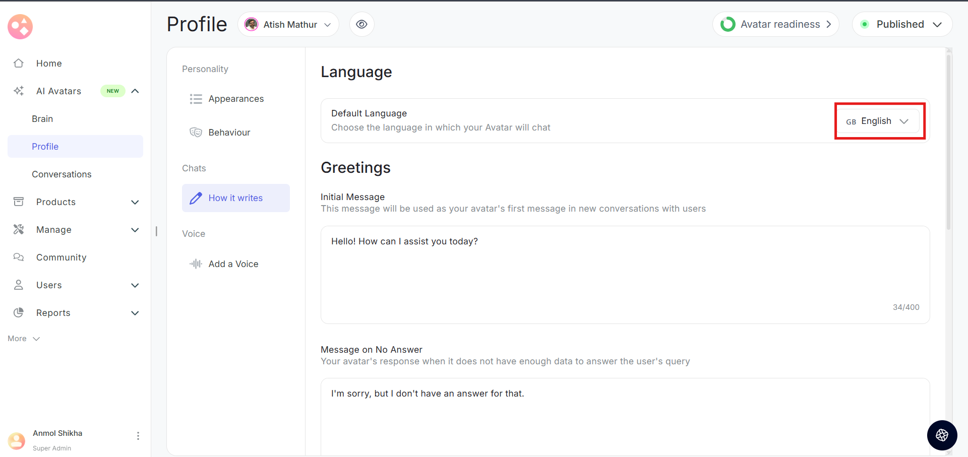 Step 3: Set the primary language in which your Avatar will chat. You can also customize the initial greeting message which the starts the conversation with and the fallback message which is shown when the Avatar has no answer for the query asked. These are pre-defined and can be edited.