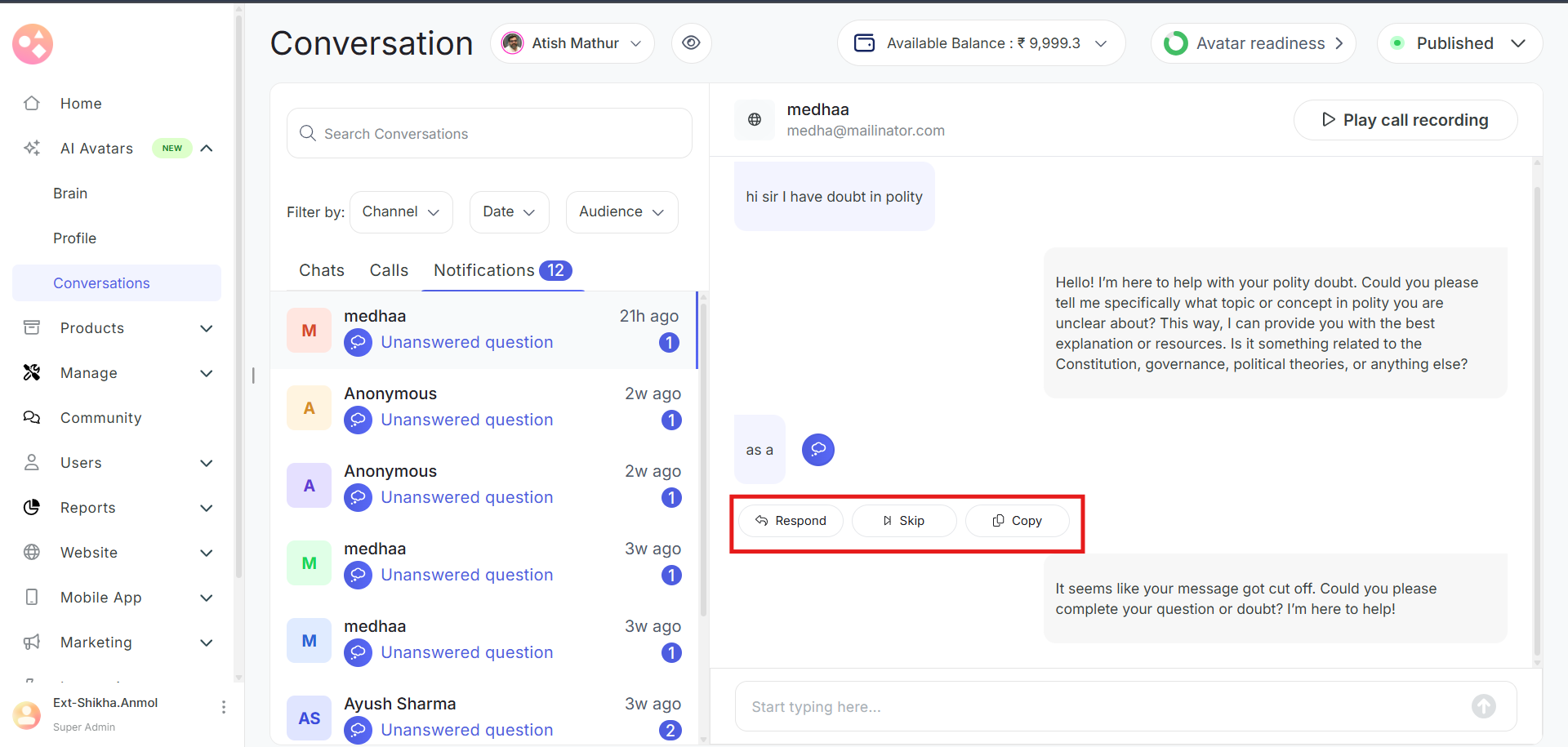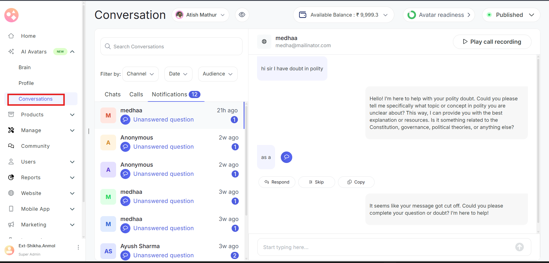 Go to the left navbar and select AI Avatars > Conversations. This section shows all the questions asked to your Avatar in chats section, as well as those it couldn’t answer in Notifications.