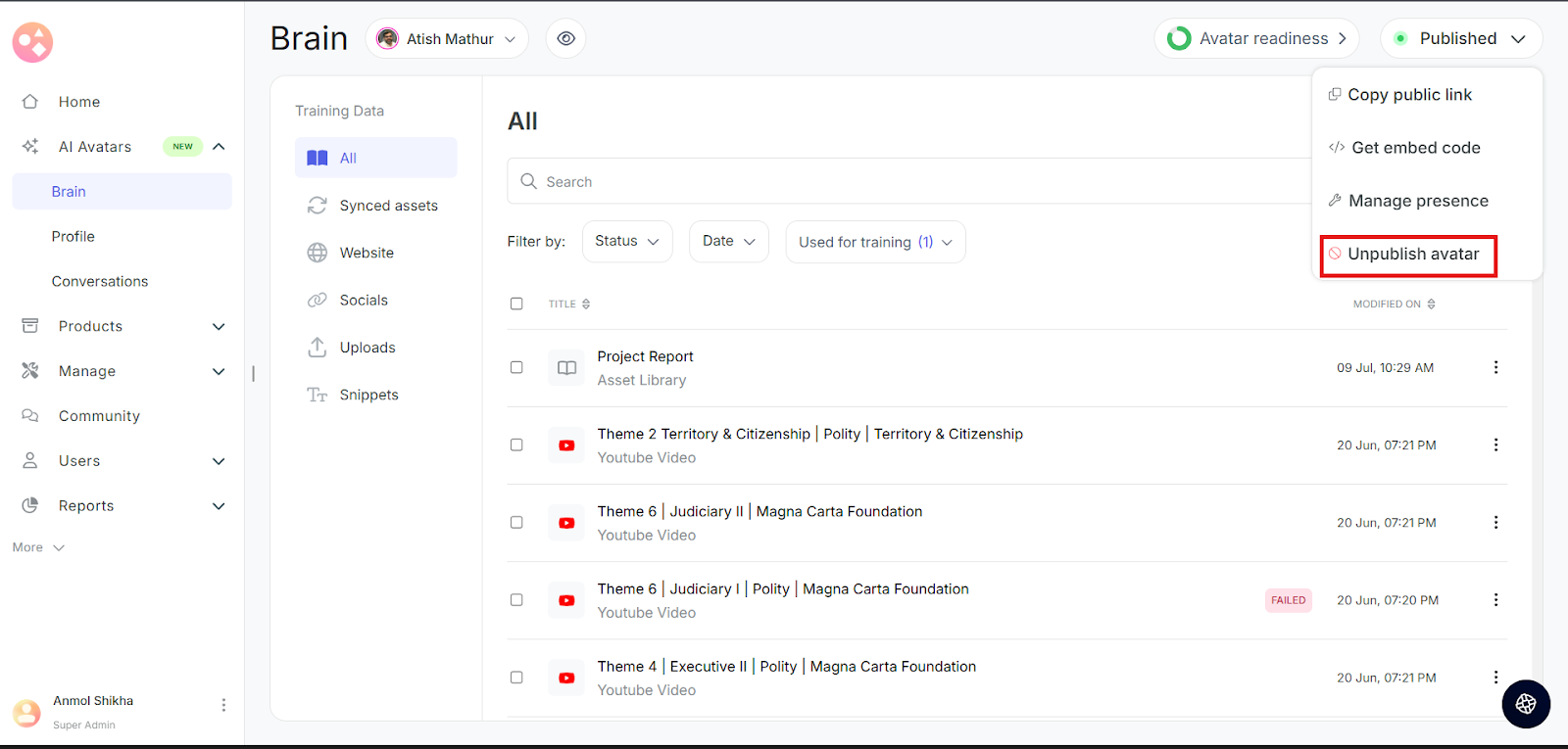 If your Avatar requires additional preparation before public deployment or you need to temporarily suspend interactions, you can unpublish it. This action makes the Avatar unavailable to learners and disables public engagement while preserving all existing data and training materials.