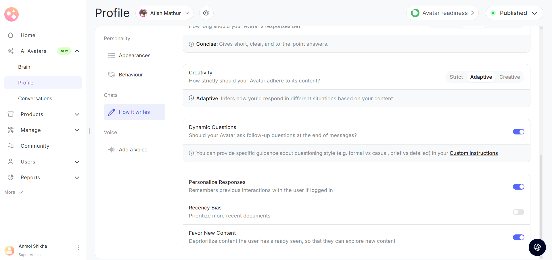 You can improve your AI avatar's response quality by updating key profile settings and providing clear training data and instructions. Follow these steps to make sure your avatar gives better, more relevant, and helpful responses to your learners.