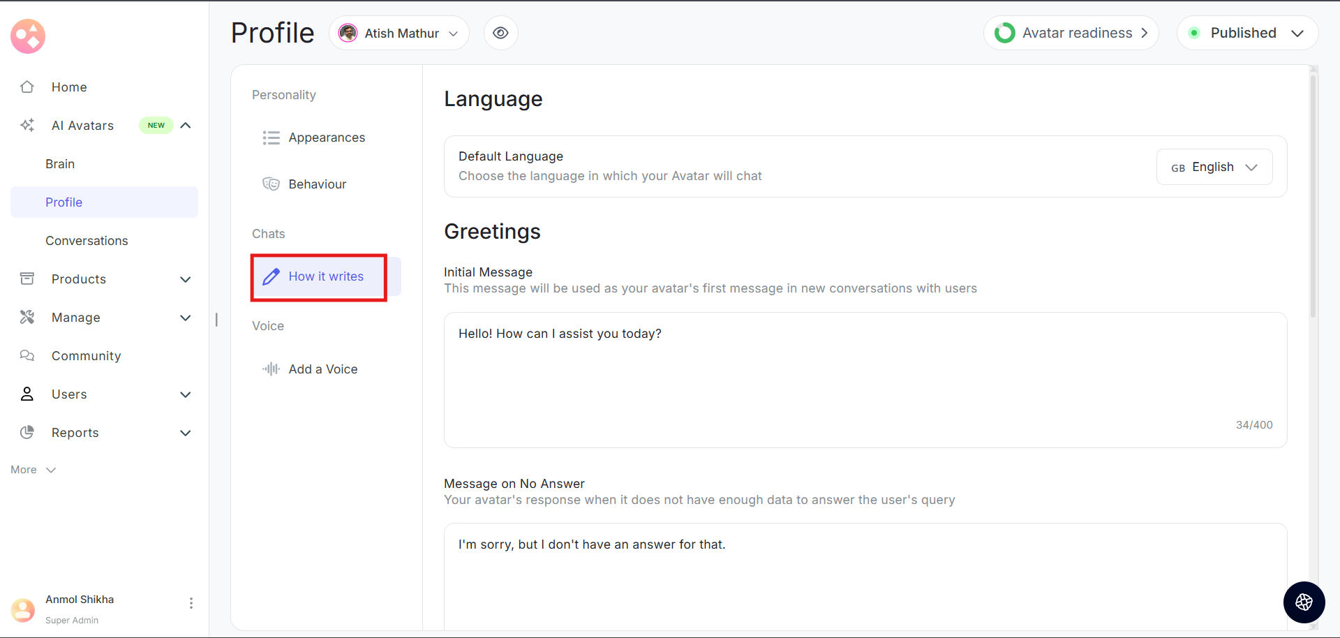 Message on No Answer: Customize what the avatar says if it can’t respond to a query.