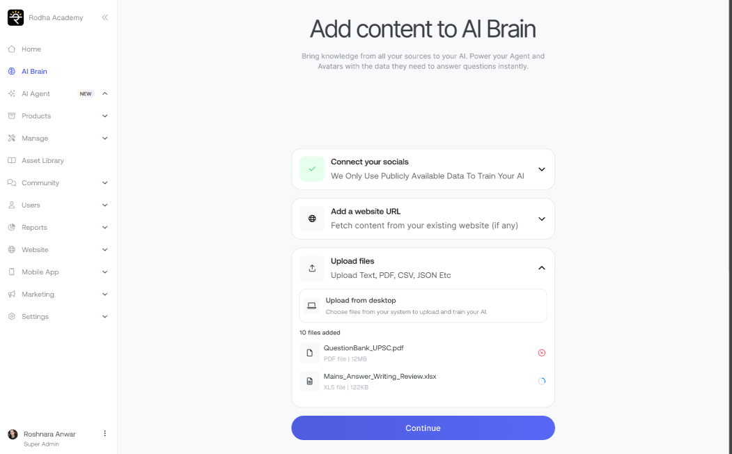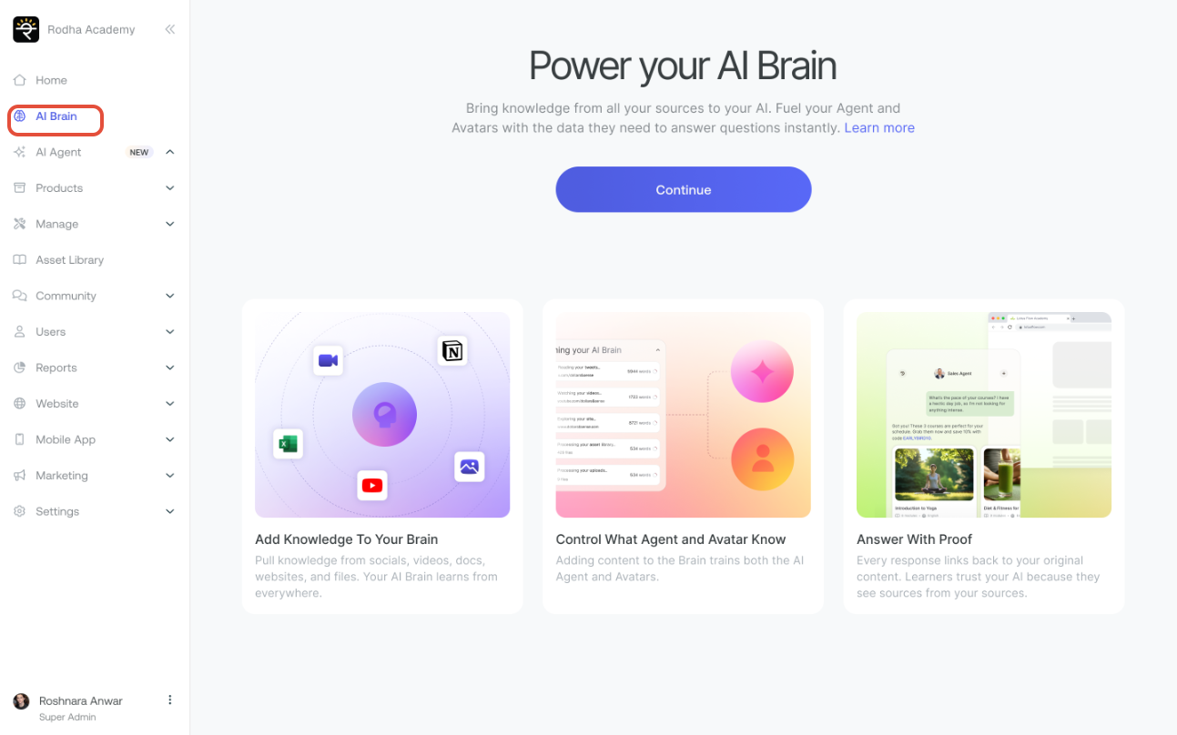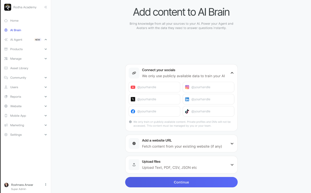 AI Brain is Seekhly’s centralized knowledge base that powers your AI Agent and Avatar. Think of it as the library of everything you know and create. By storing your content here whether it’s social media, websites, or course materials you make your Agent and Avatar smarter, more accurate, and more personalized.