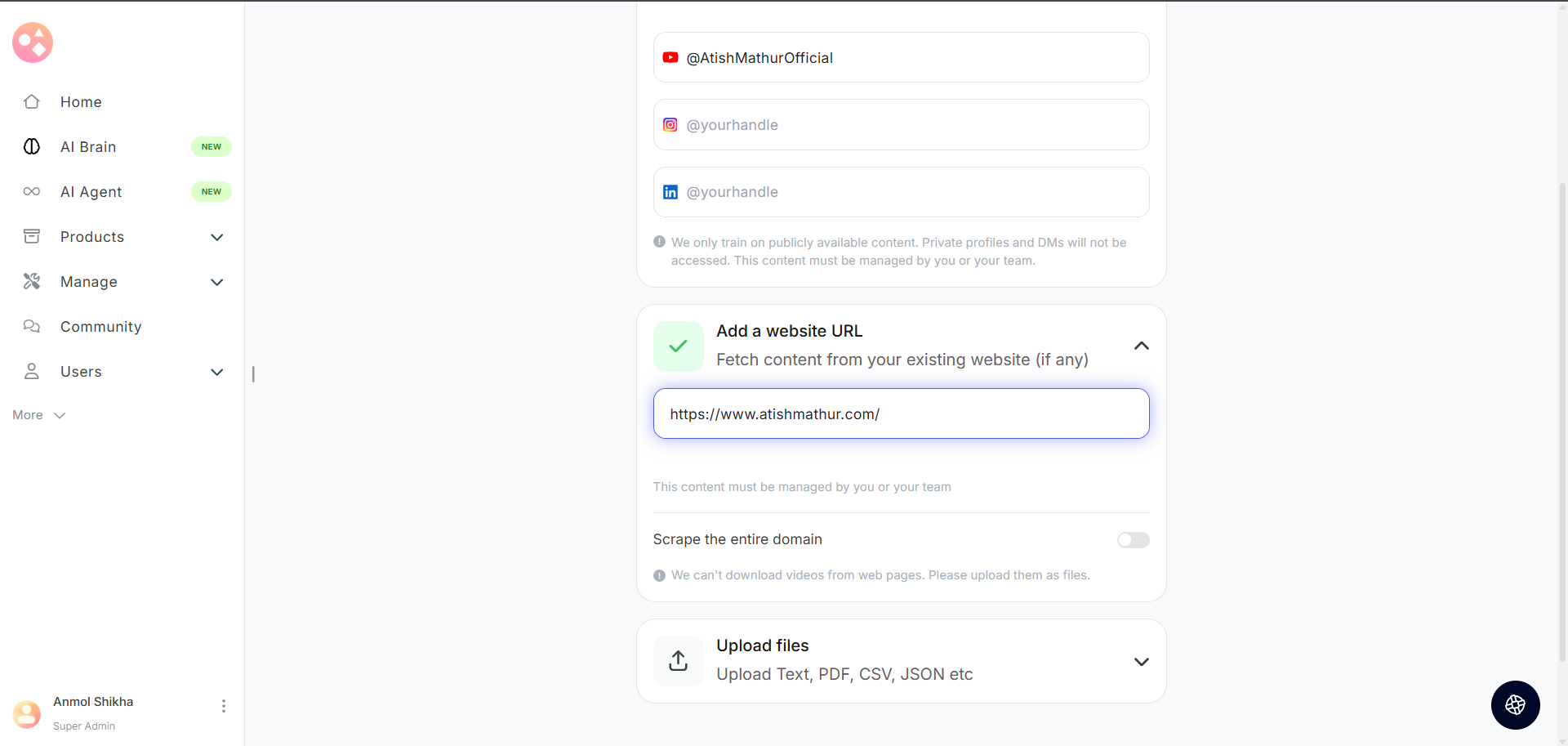 Add the link of your website, blog, or portfolio, this will allow AI Brain to pull knowledge directly from there.
