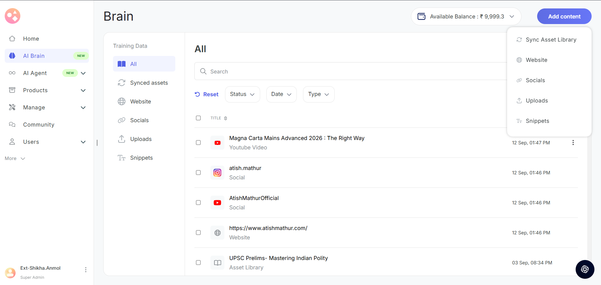 Keeping your AI Brain updated ensures that your Agent and Avatar always sound accurate, and aligned with your expertise. You can manage your content in two ways: