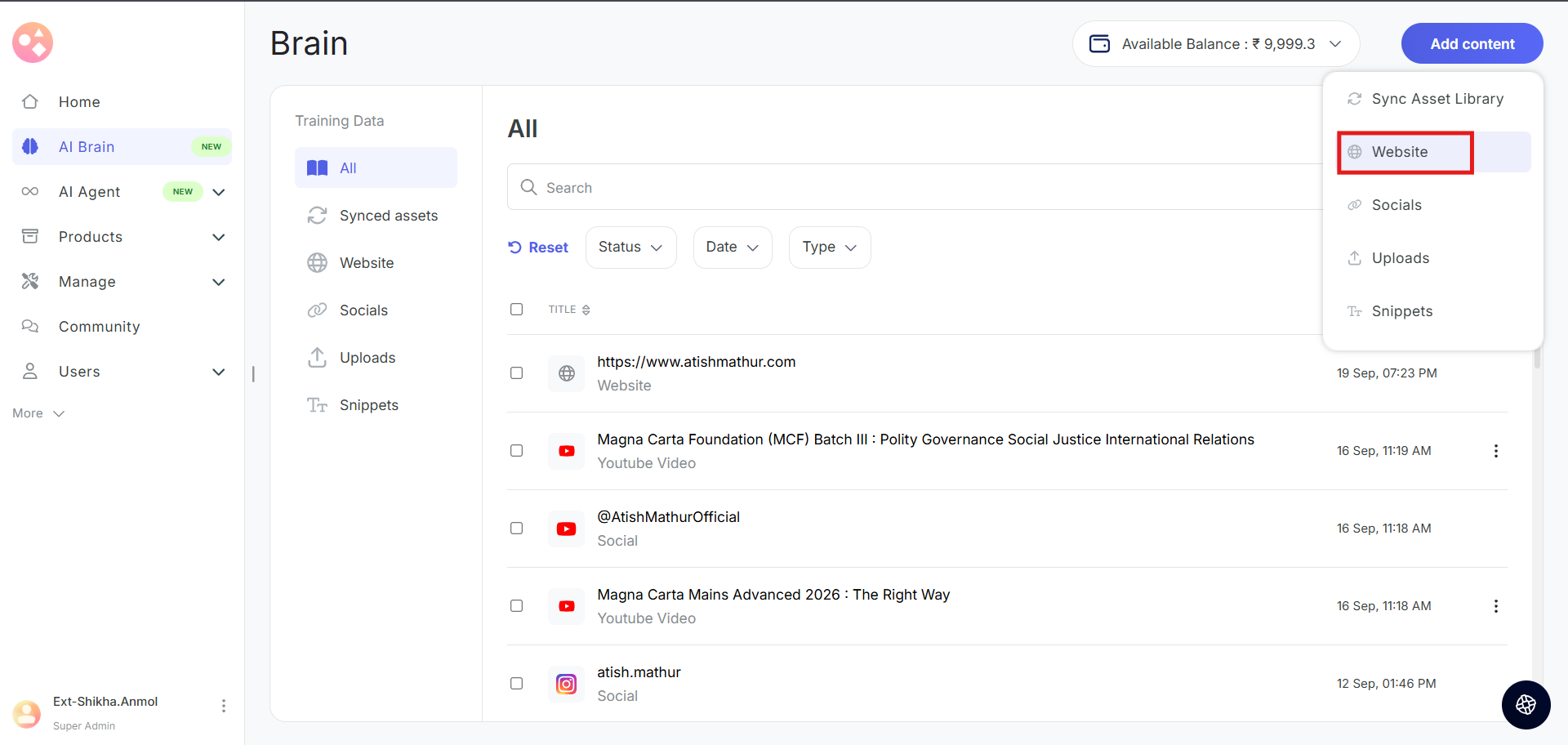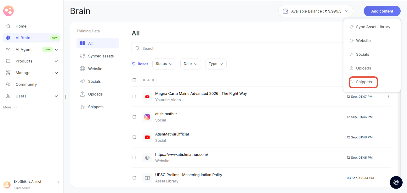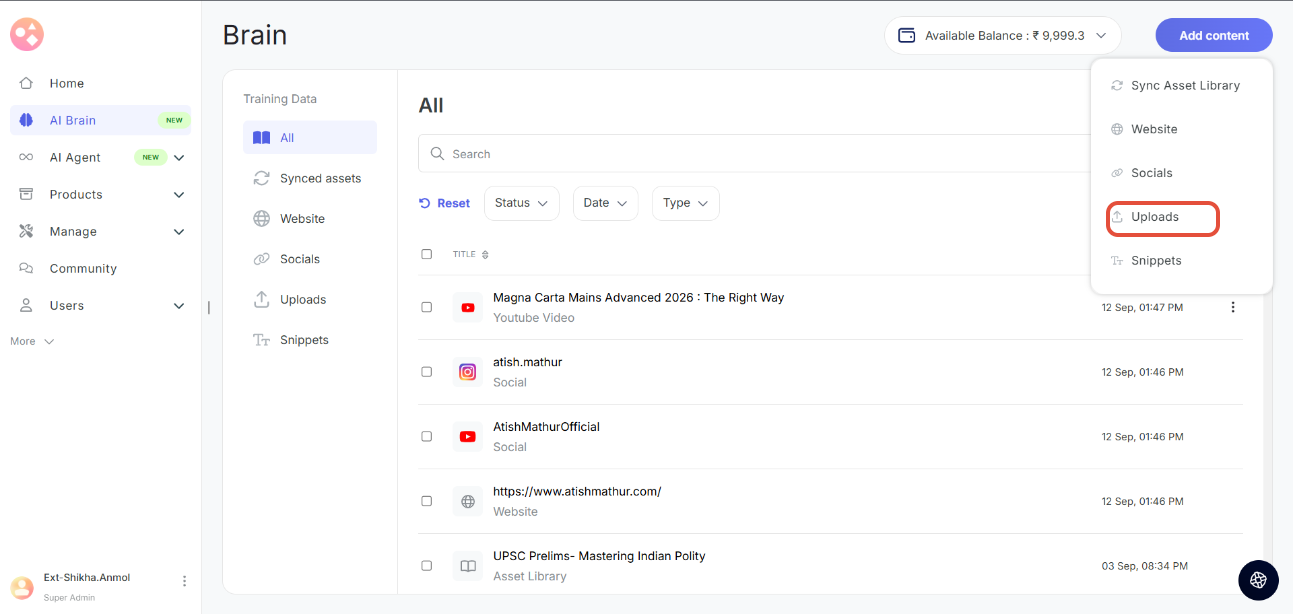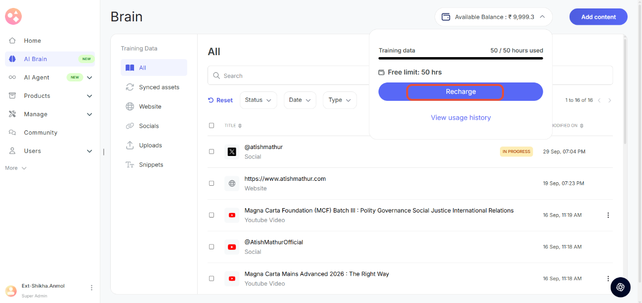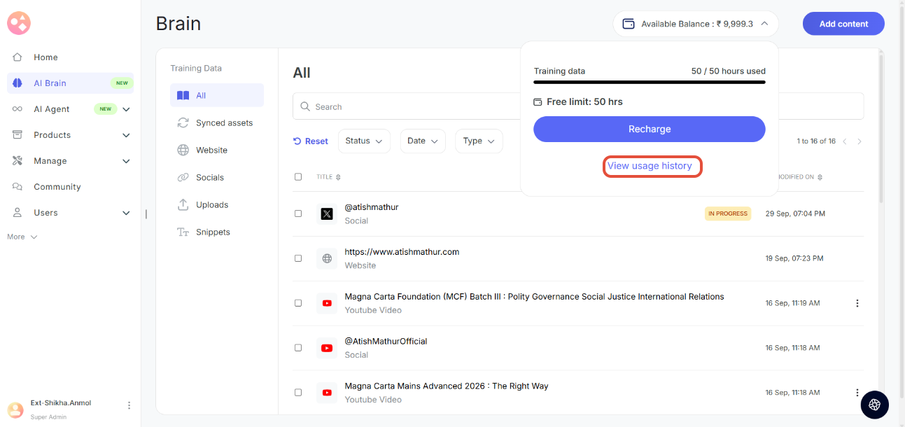 - Wallet Balance: Your Seekhly account includes a wallet that holds credits used for AI Brain training. You can view your current balance in the top-right corner of the AI Brain page.