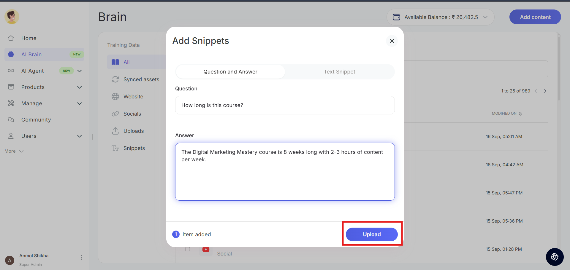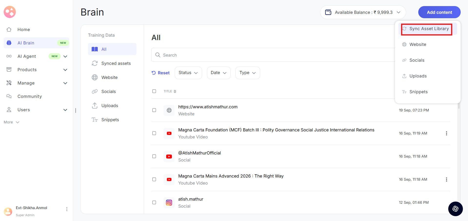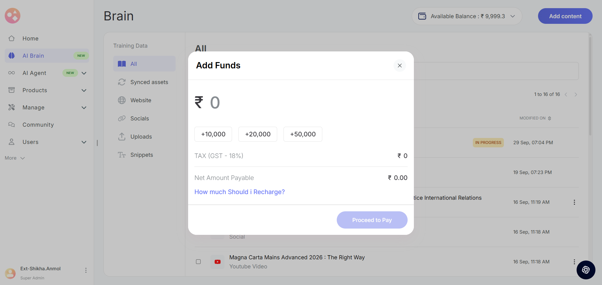 - Wallet Balance: Your Seekhly account includes a wallet that holds credits used for AI Brain training. You can view your current balance in the top-right corner of the AI Brain page.