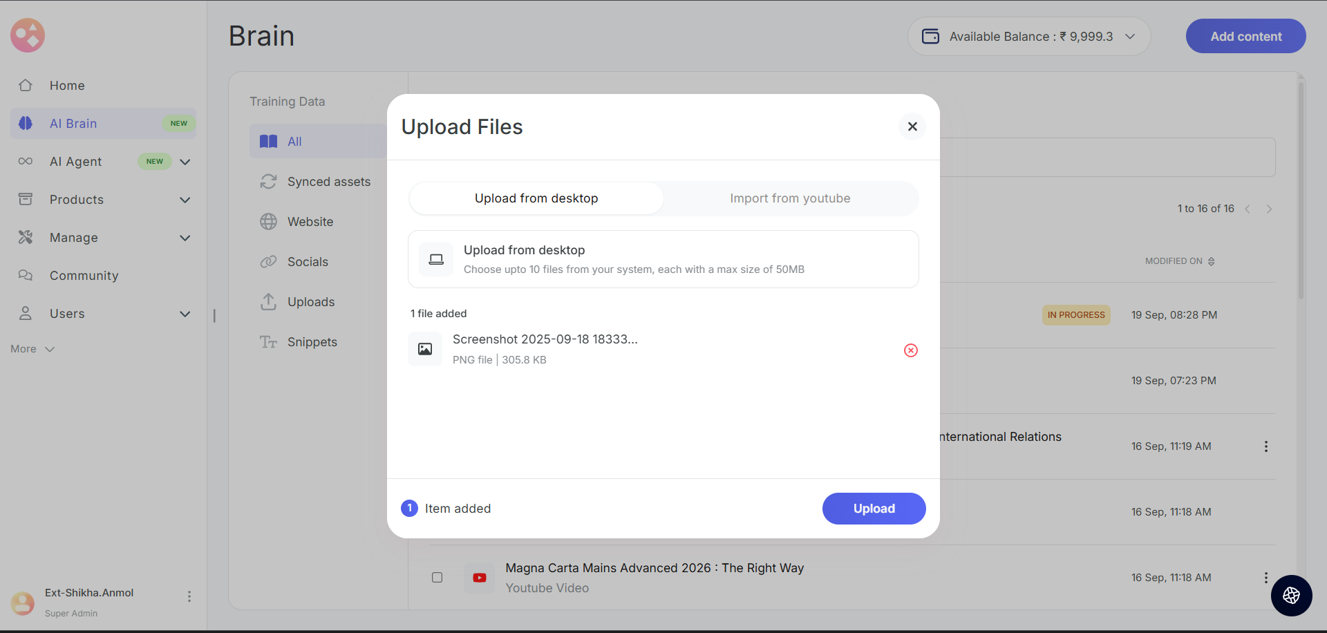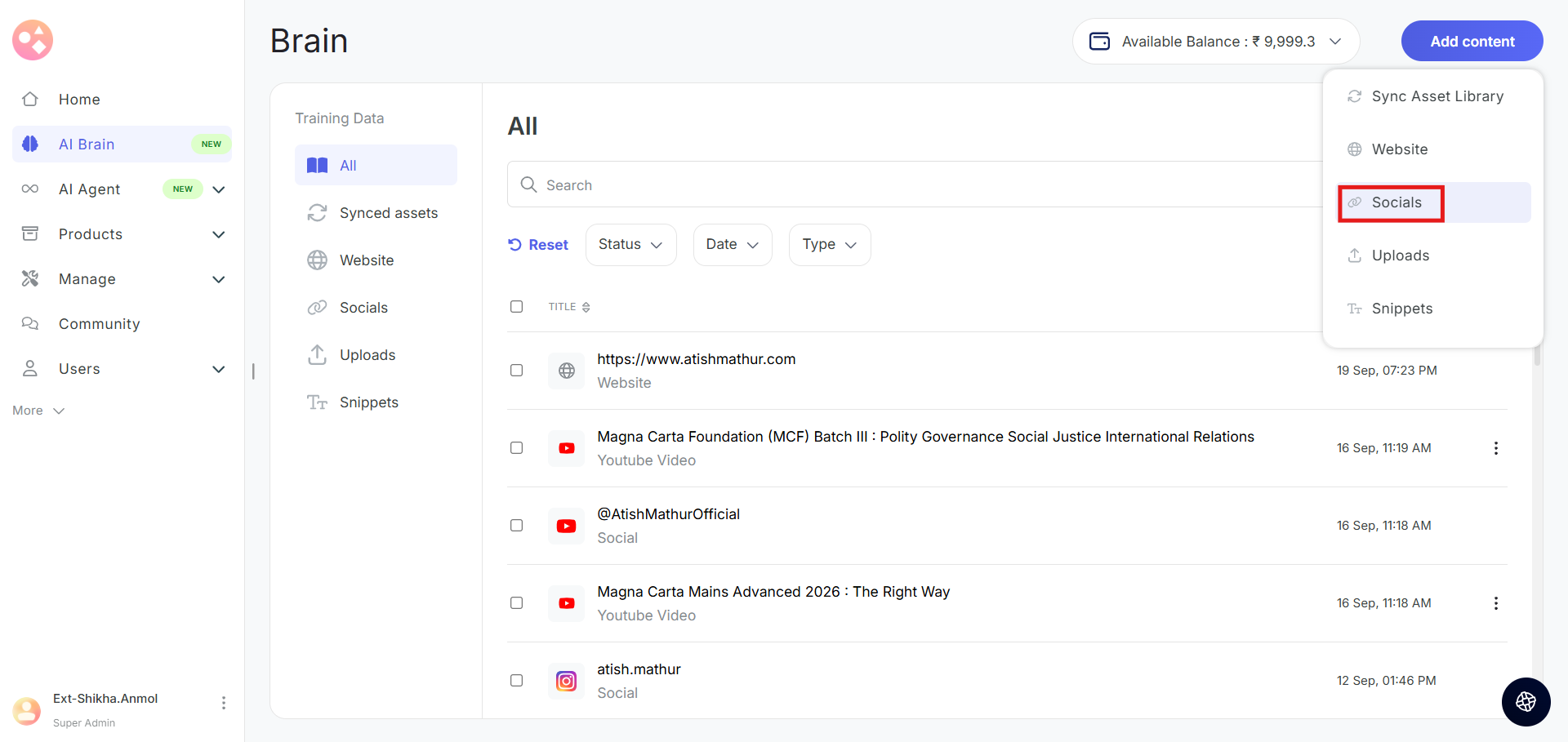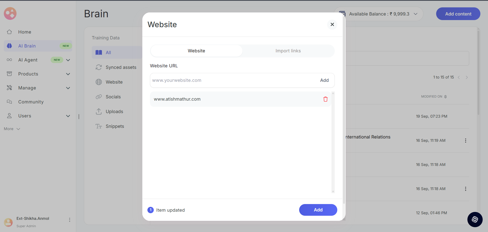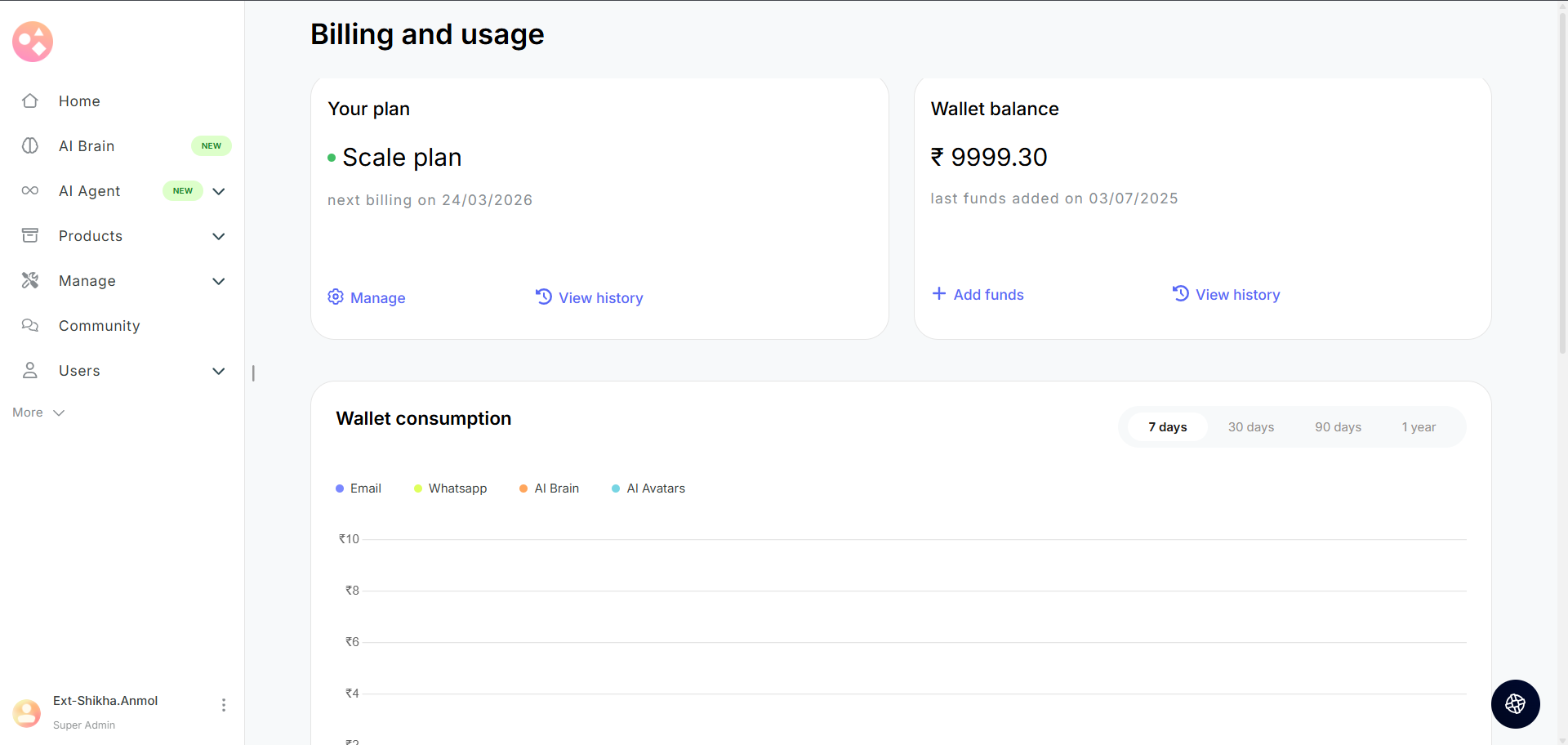 - Wallet Balance: Your Seekhly account includes a wallet that holds credits used for AI Brain training. You can view your current balance in the top-right corner of the AI Brain page.