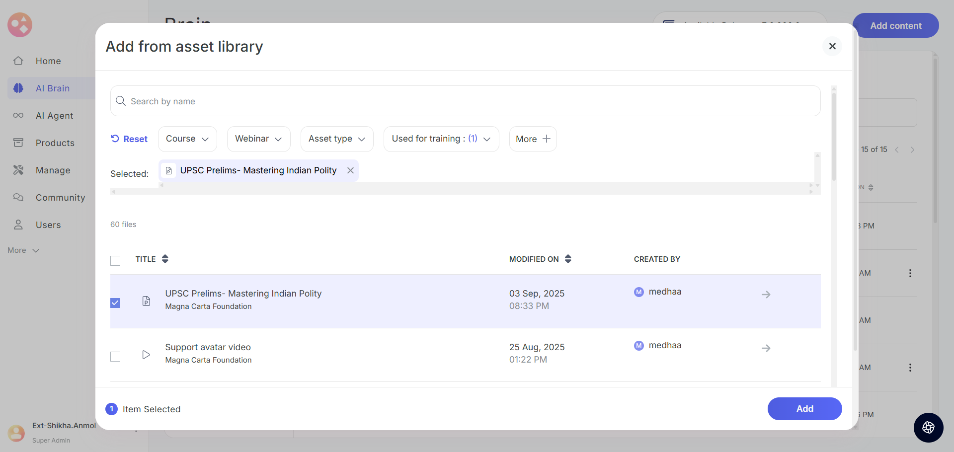 Adding data in your AI Brain will automatically assign content to an Agent or Avatar. Think of it like a teacher sharing lessons with students. Whatever you put into the Brain notes, lessons, files, social posts gets automatically shared with your Agent and Avatar. This way, they always have the correct knowledge to answer questions.