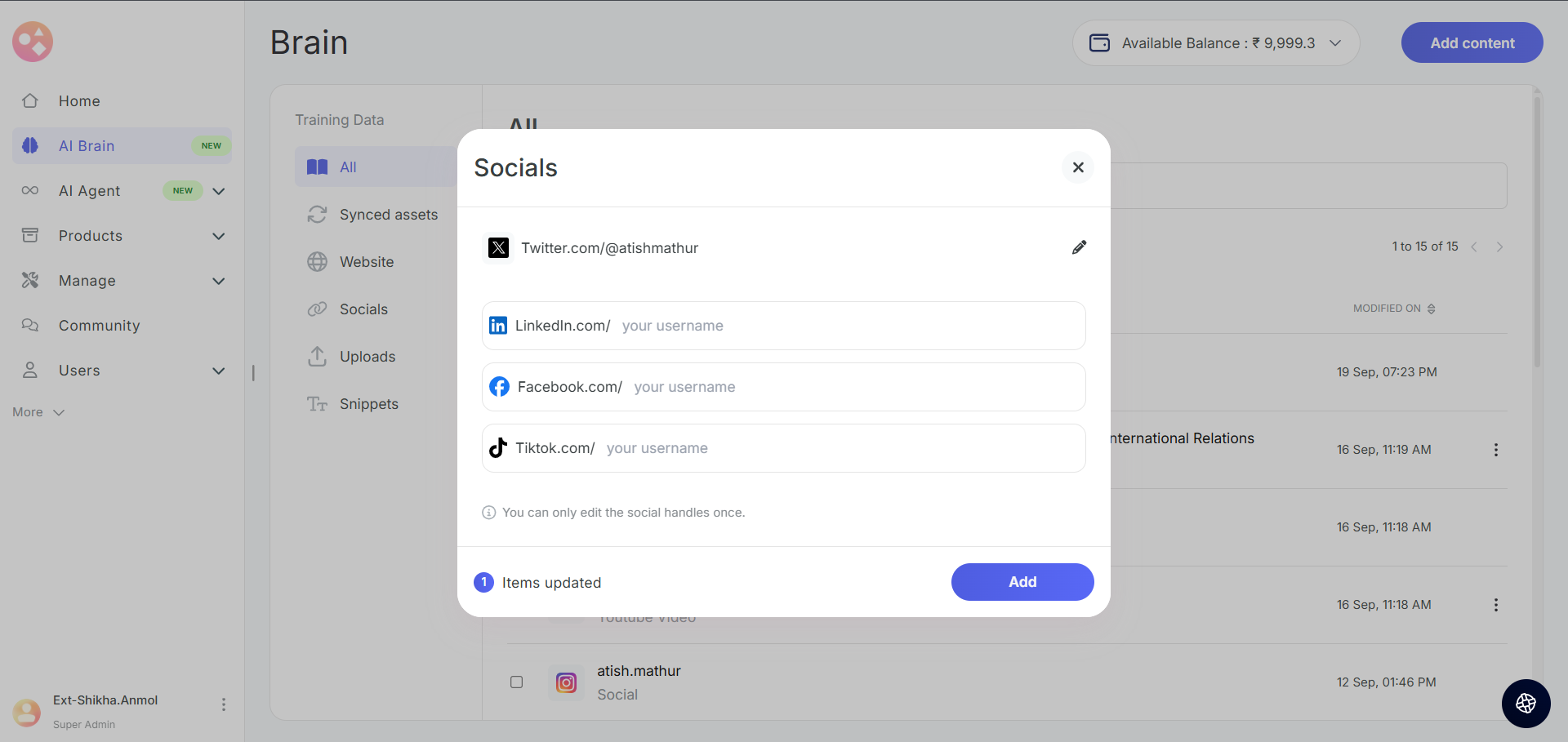 You can add your social media handles to import public posts from platforms like YouTube, Instagram, LinkedIn.